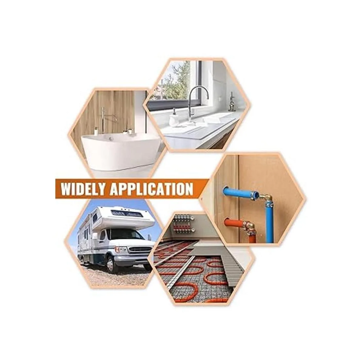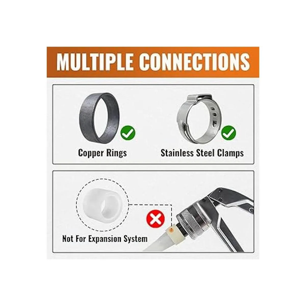 Productos Compatibles : Uso con anillos de abrazadera de acero inoxidable, o herramienta de crimpado PEX y anillos de cobre. Los anillos de la lámpara no están incluidos en este juego.