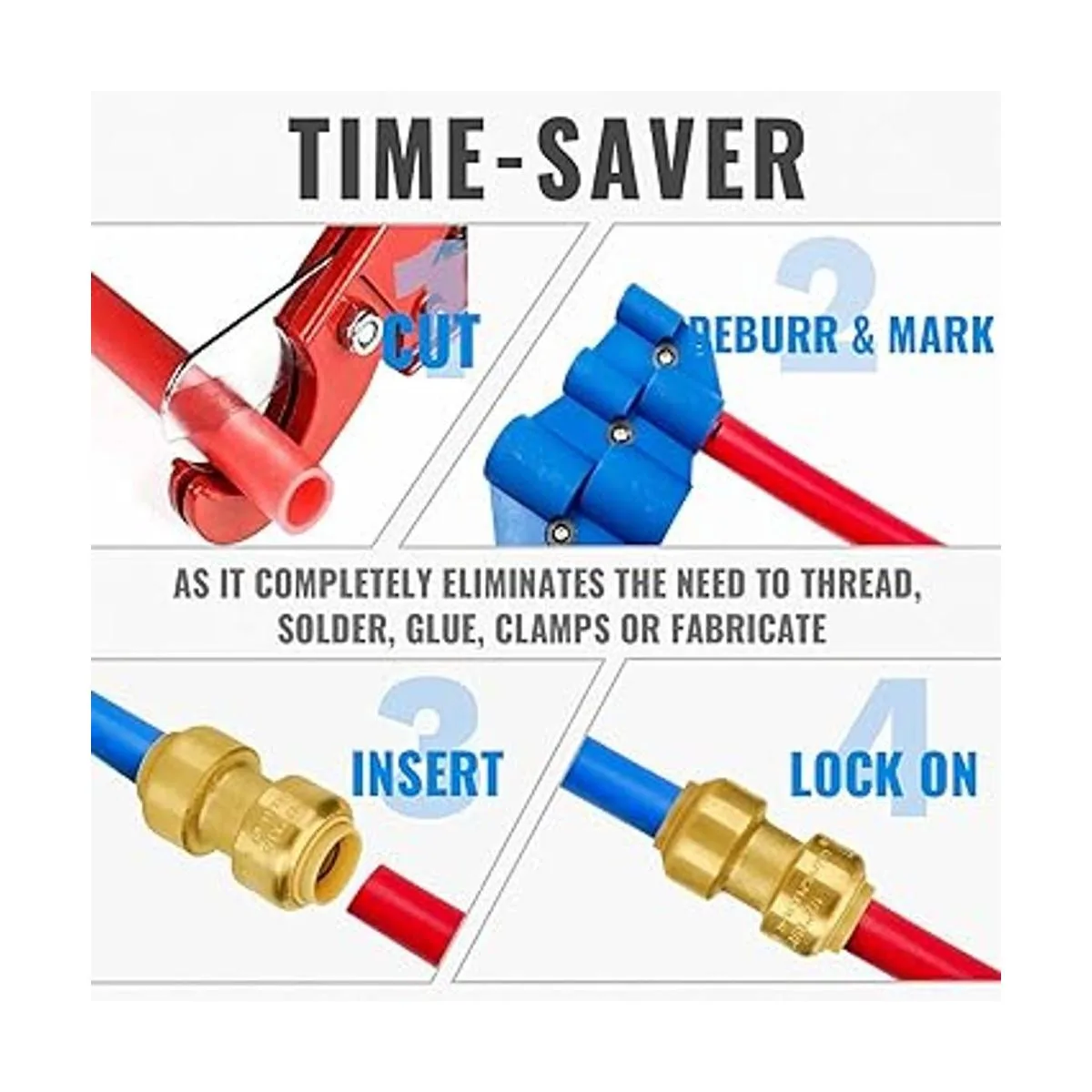 Fácil instalación: se instala más rápido y más seguro que los métodos tradicionales con accesorios de latón a presión y la facilidad de uso reduce los errores de instalación, ya que eliminan completamente la necesidad de soldar, engarzar, pegamento, enhebrar o fabricar de cualquier forma; simplemente empuja y bloquea el tubo para obtener un rendimiento perfecto.