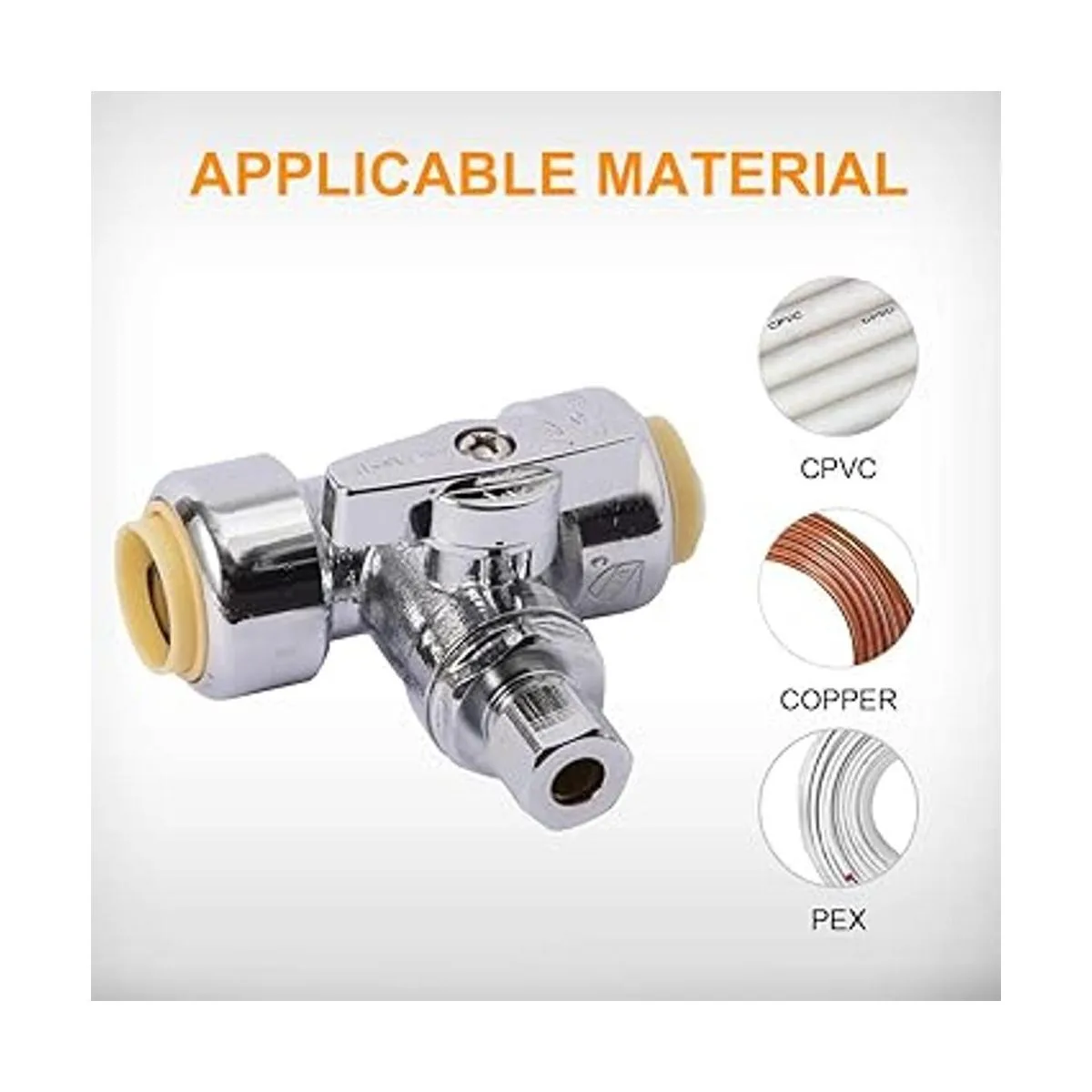 SUNGATOR Service Tee Stop Valve, 12 Ptc x 12 Ptc x 14 Compresión, 14 de vuelta Push Fit Válvula de agua Apague con clip de desconexión y cinta, PushtoConnect, PEX, cobre, CPVC, latón sin plomo