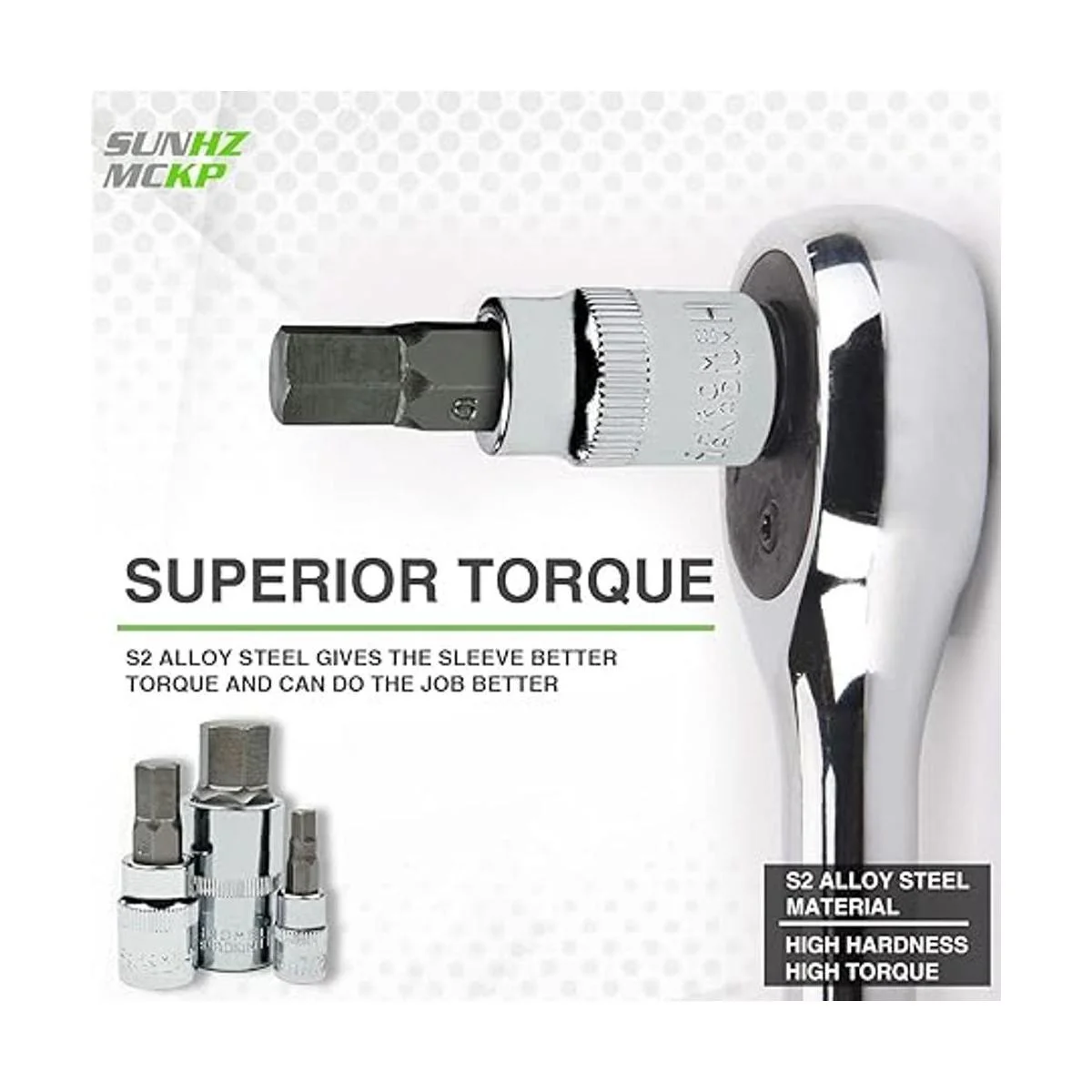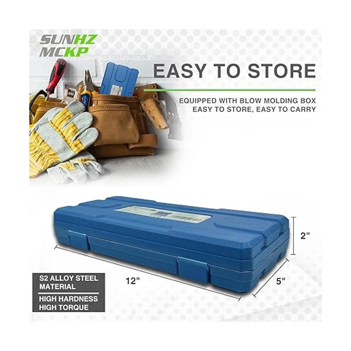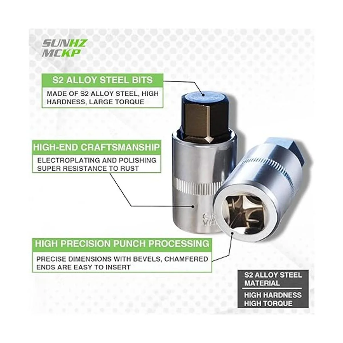 Duradero y antioxidante: se adopta acero de aleación S2, que se trata térmicamente después de forjar para proporcionar una dureza ultra alta y un par de torsión mejorado. El proceso de chapado y pulido proporciona una gran resistencia a la corrosión. Cada funda tiene dimensiones y biseles precisos, y el extremo biselado es fácil de insertar para proteger la broca y los cierres.