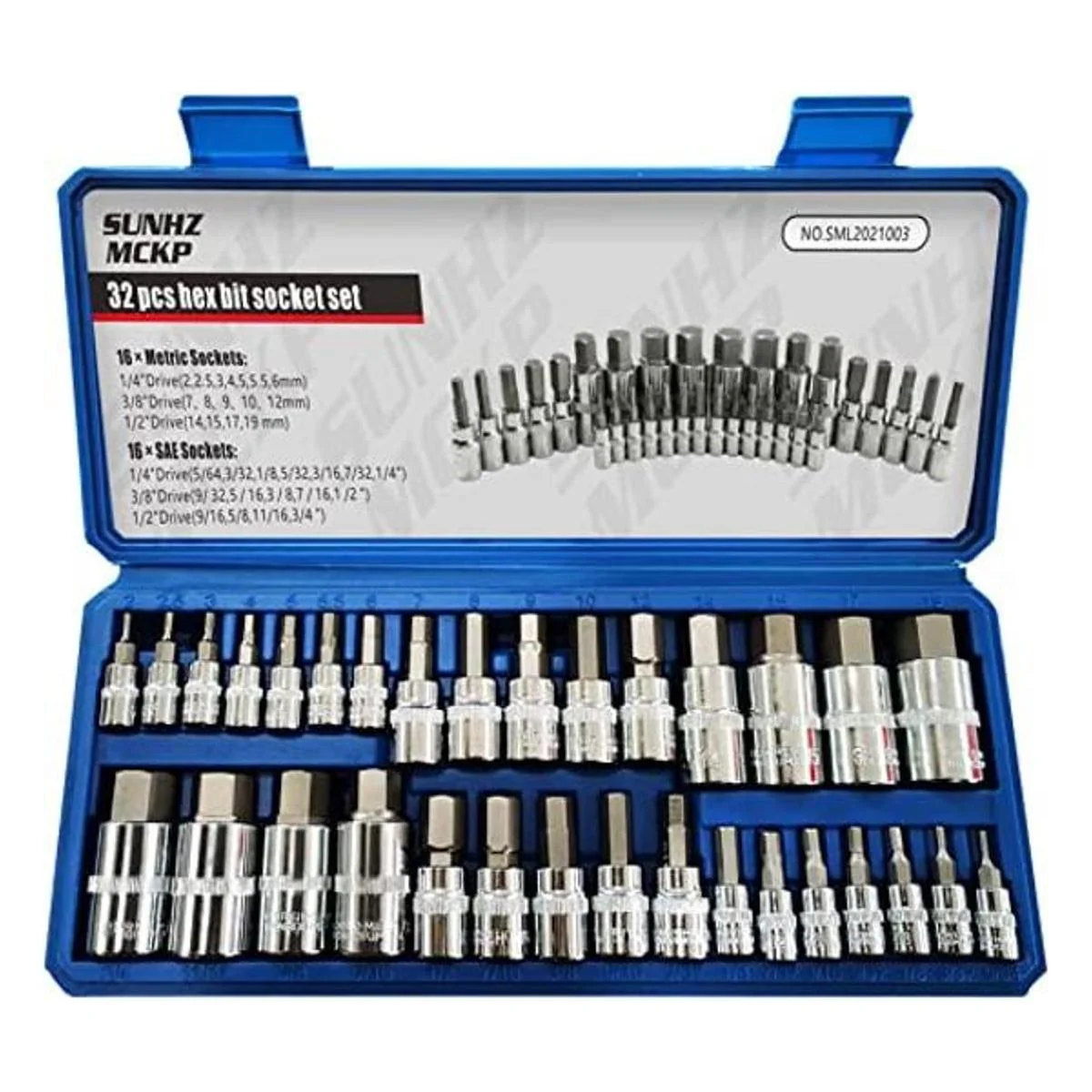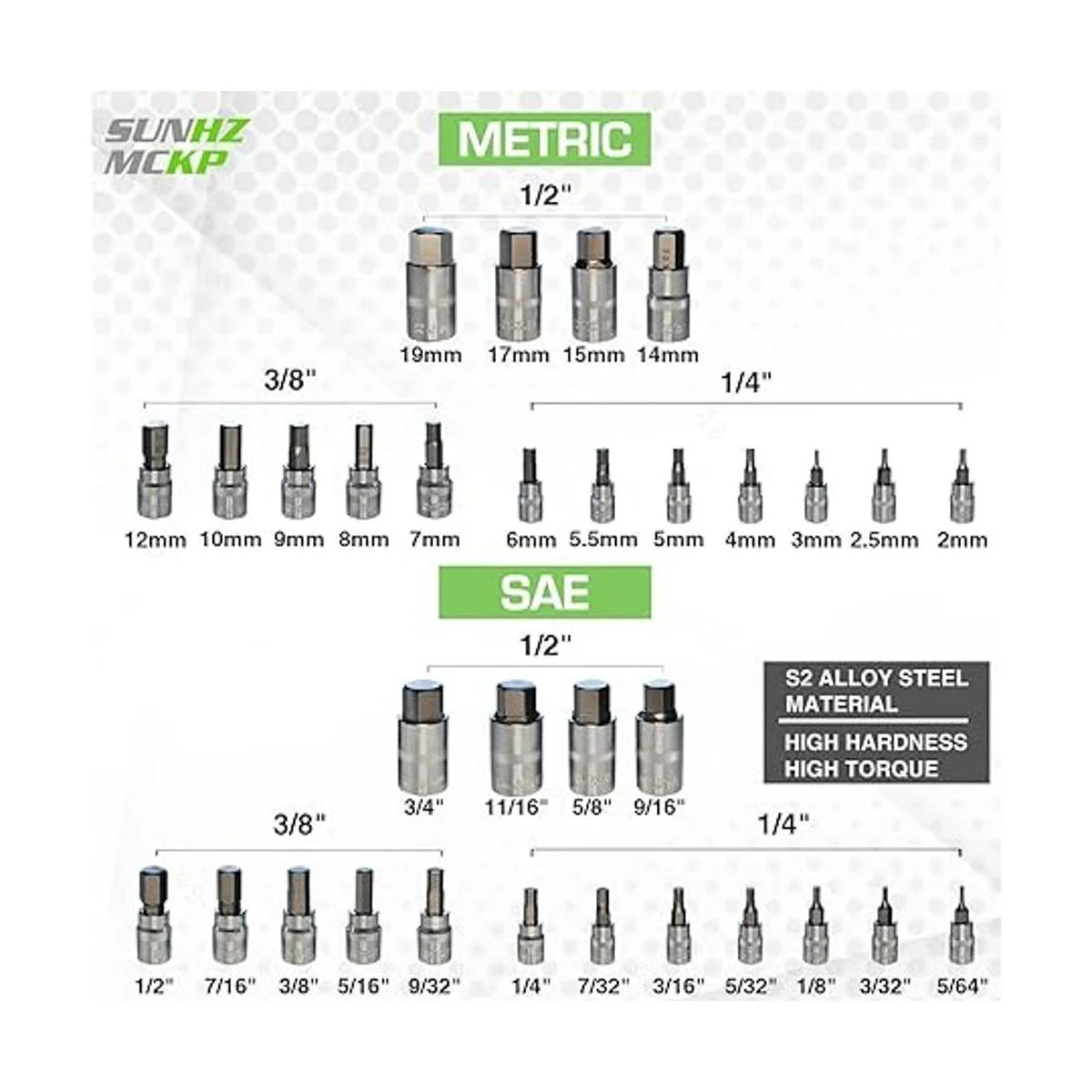 SUNHZMCKP Juego de llaves hexagonales maestras, 32 piezas, brocas mecanizadas de acero S2, enchufes estándar SAE y métricas, unidades de 14, 38 y 12 pulgadas