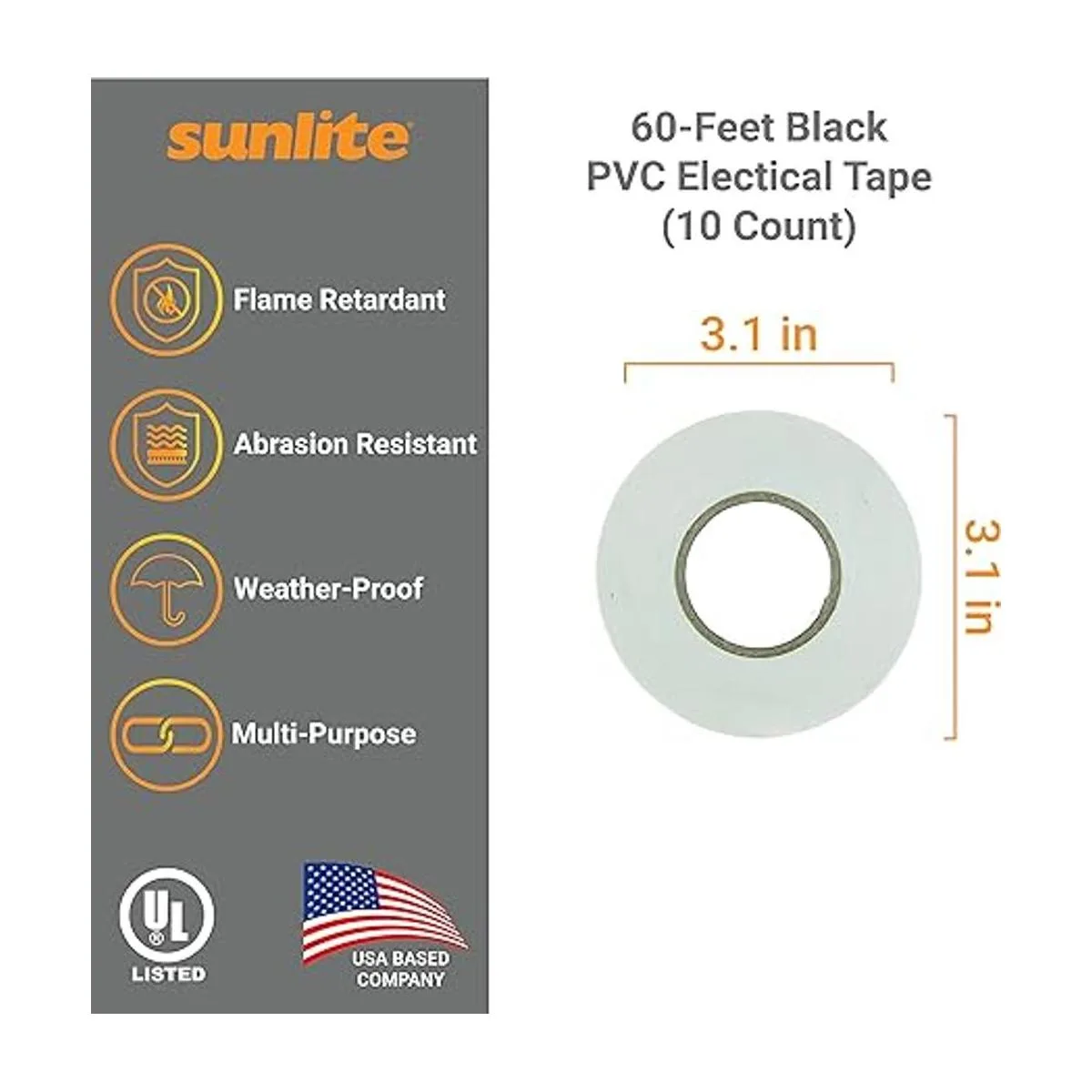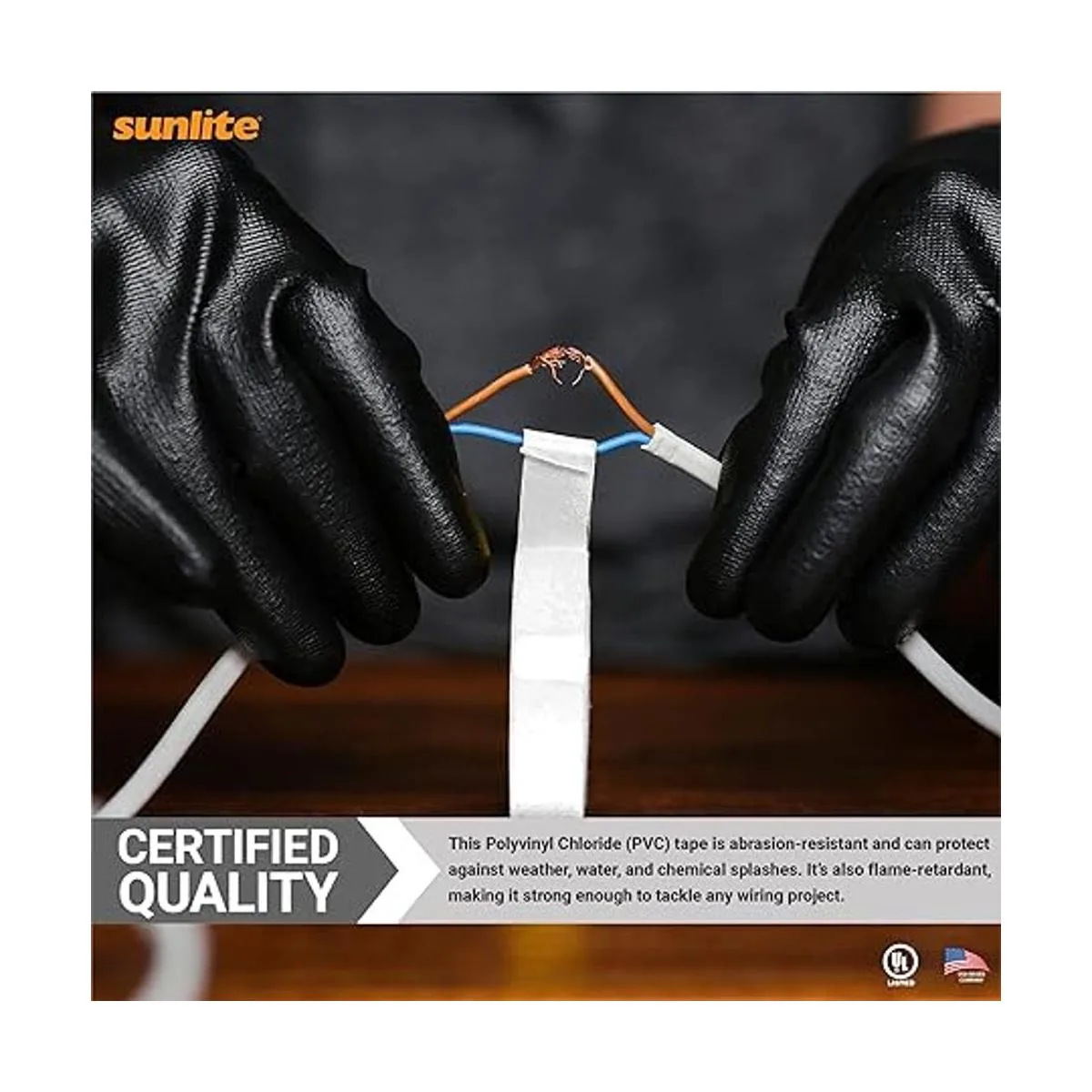 Sunlite 41325SU Paquete de 10 cintas eléctricas de PVC de 60 pies x 0.75 pulgadas, para empalmar, proteger y aislar cables, resistente a la abrasión, ignífuga, resistente a la intemperie, certificación UL, blanco, 10 unidades
