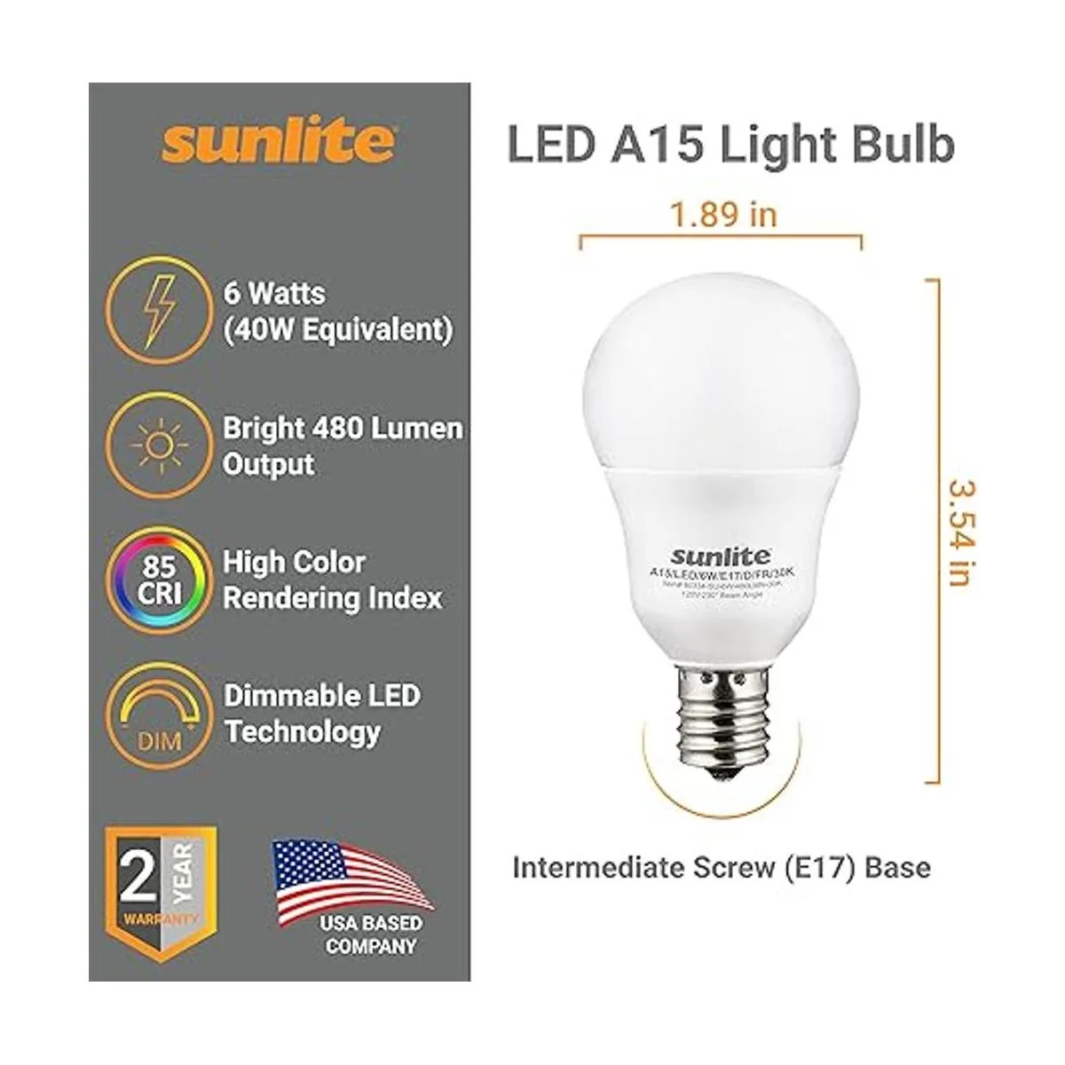 Sunlite 41409SU Bombilla LED A15, 6 vatios equivalente a 40 W, base intermedia E17, 480 lúmenes, regulable, acabado esmerilado, certificación ETL, 6 unidades, blanco cálido de 3000 K