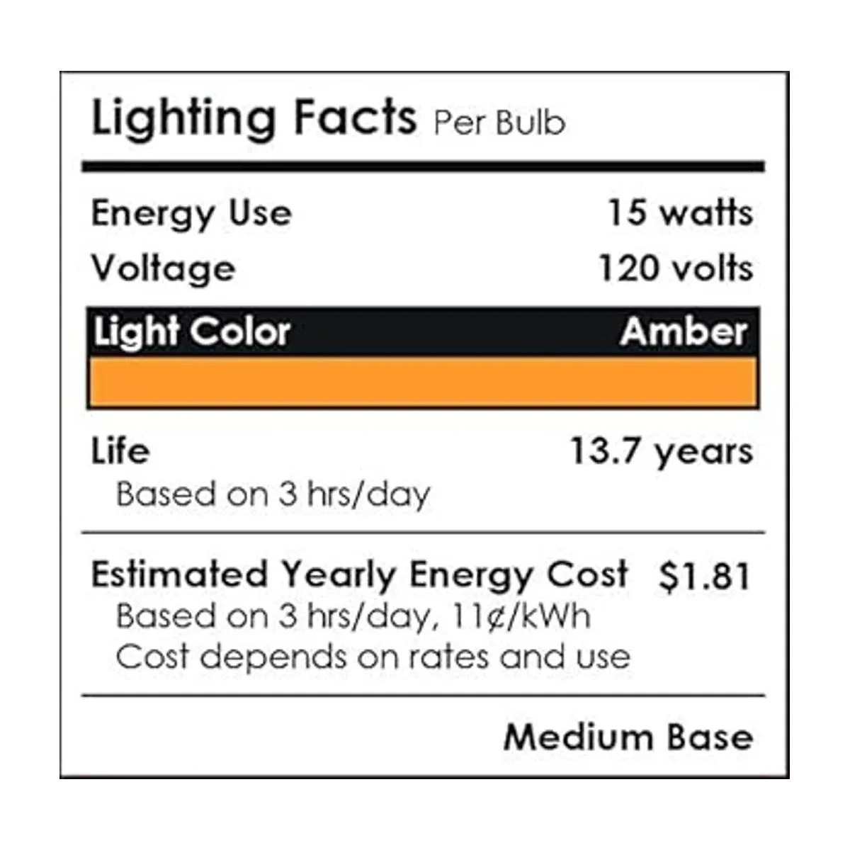 Eficiencia energética: estas bombillas solo utilizan 15 W de electricidad y ponen una luz ámbar única que es equivalente a una bombilla halógena de 75 W. El coste anual de energía es de un bajo 1.81 basado en 3 horas/día a 0.11/kWh