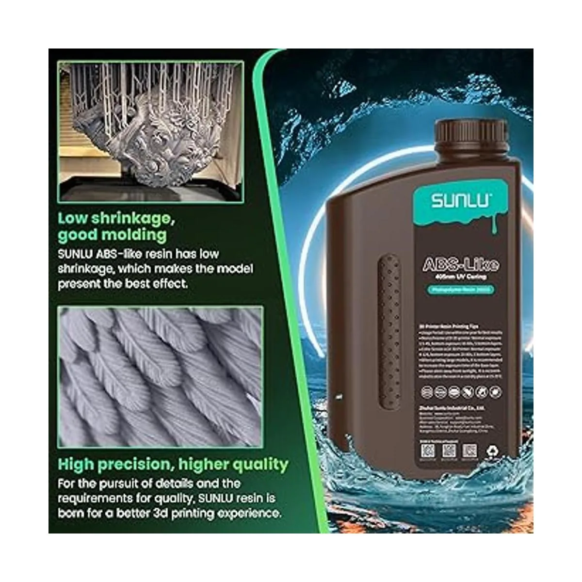 Menos frágil y más resistencia En comparación con otros tipos de resina de impresora 3D, la resina de fotopolímero SUNLU ABS tiene una mejor dureza, no es frágil y tiene una excelente resistencia a la abrasión. Si necesitas imprimir objetos en miniatura o pequeños, la resina de impresora 3D SUNLU ABS es tu primera opción.