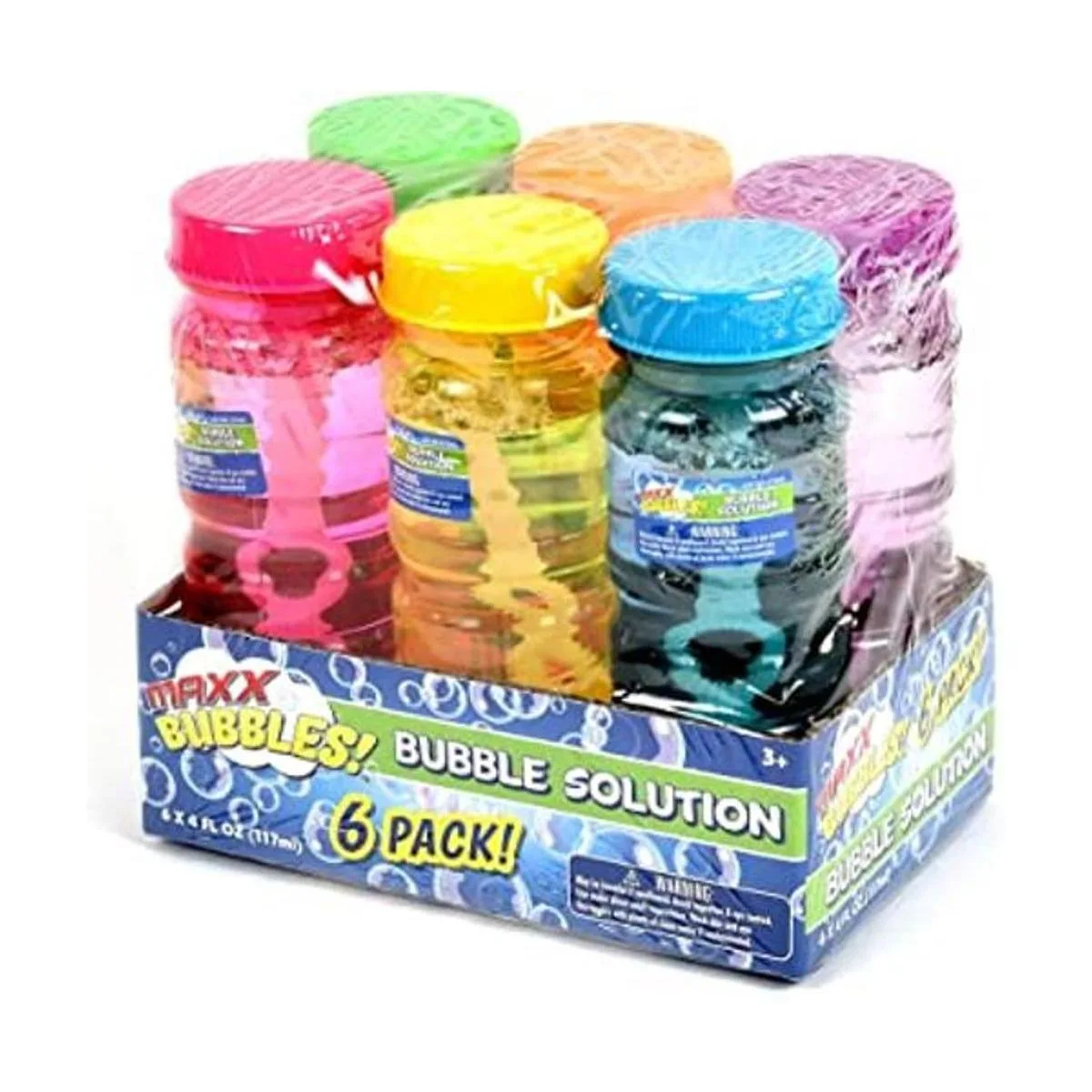 Sunny Days Entertainment Paquete de 6 botellas de solución para burbujas botellas de burbujas de 4 onzas con varitas de 6 agujeros Solución de burbujas para niños Juguete de fiesta de cumpleaños Maxx Bubbles