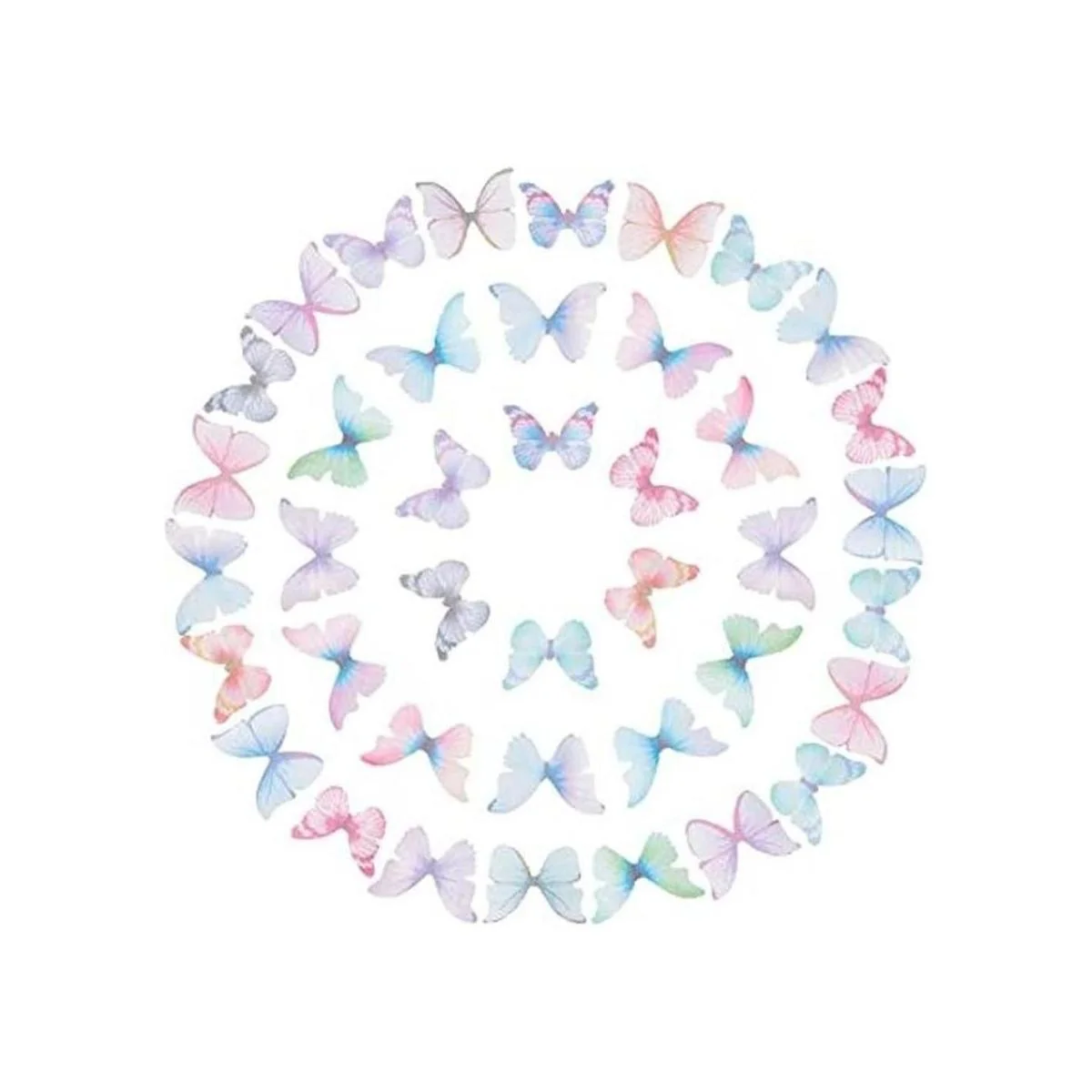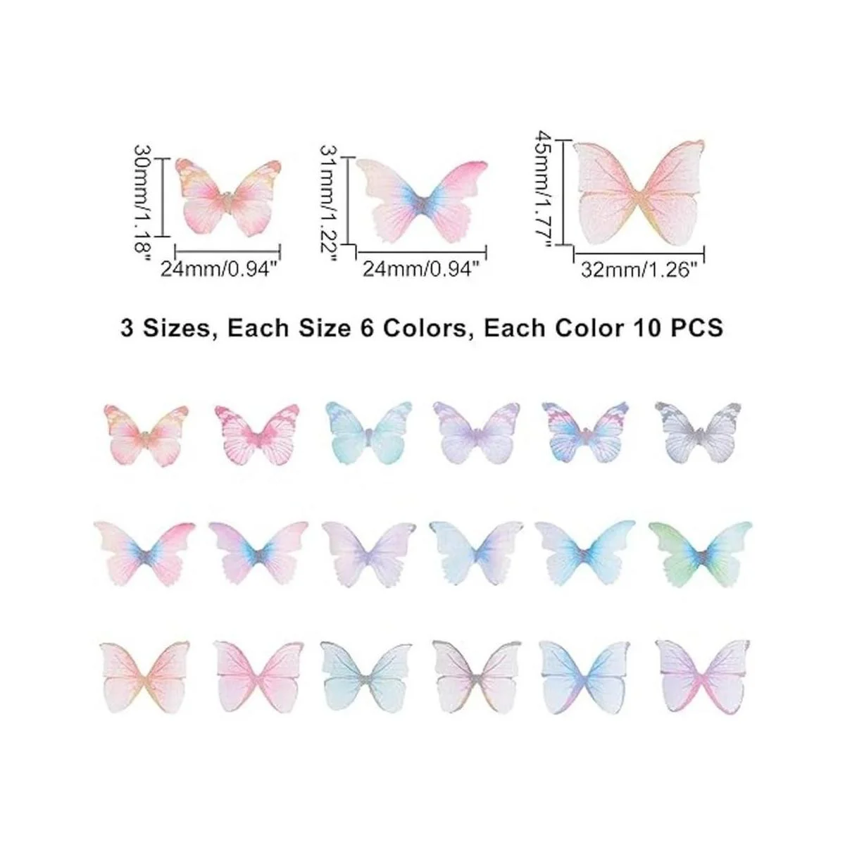 Tamaño: alas de mariposa de organza de aproximadamente 0.945 x 1.181 in, 6 colores, 10 unidades de cada color.