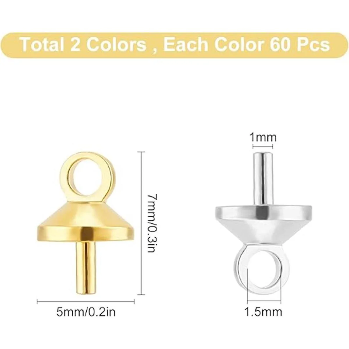 SUNNYCLUE 1 caja de 120 piezas de 2 colores de acero inoxidable con forma de perla, colgante de metal con agujero pequeño, perla, tornillo de ojo, para hacer abalorios de cuentas medio perforadas