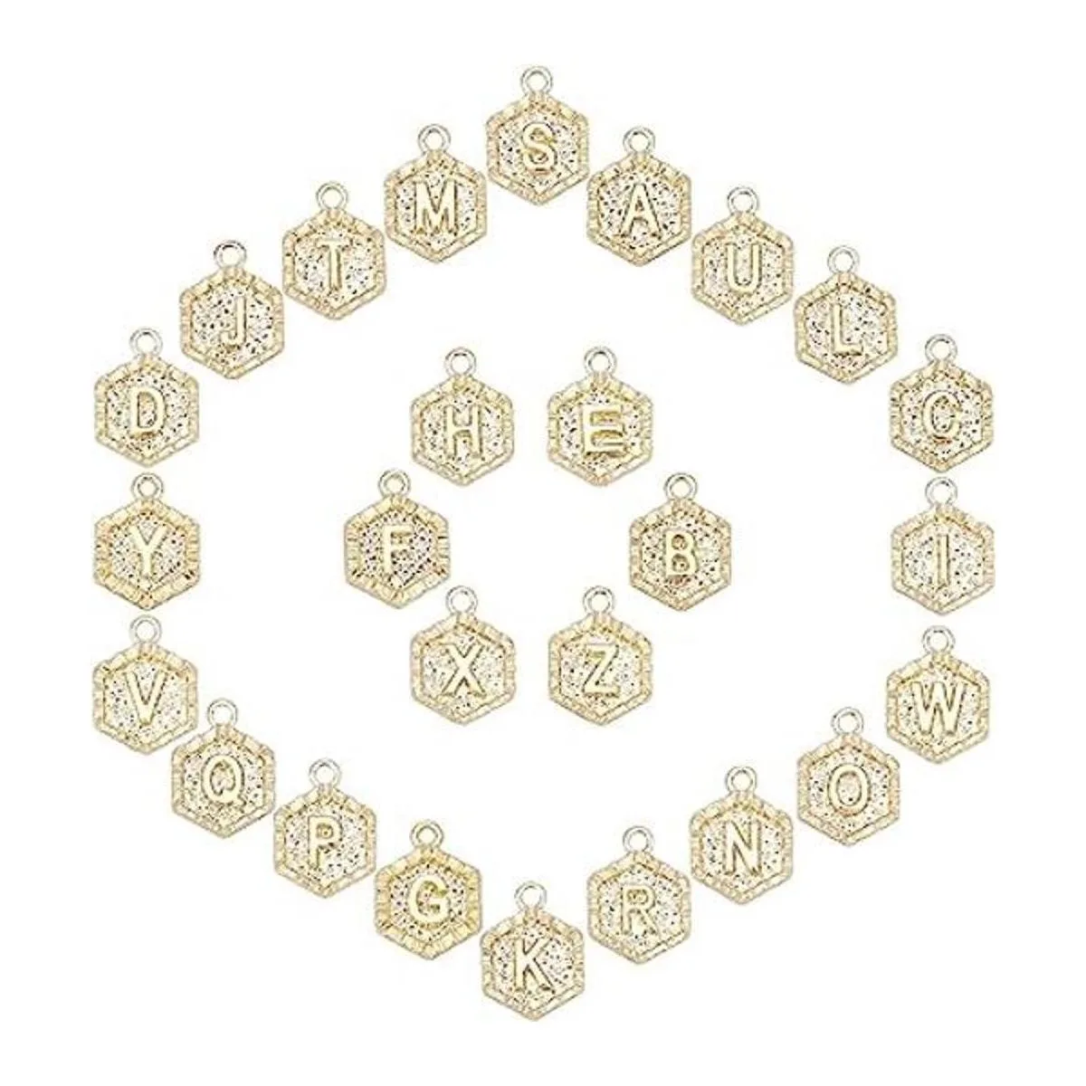 SUNNYCLUE 1 caja de 26 dijes hexagonales chapados en oro de 18 quilates con letras del alfabeto a granel para pulseras, collares, copas de vino, joyas, bodas, día de San Valentín