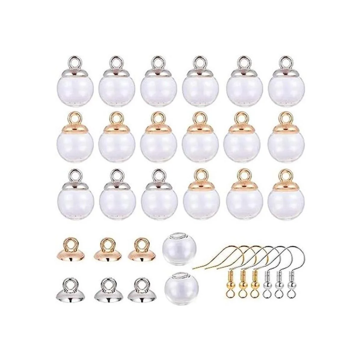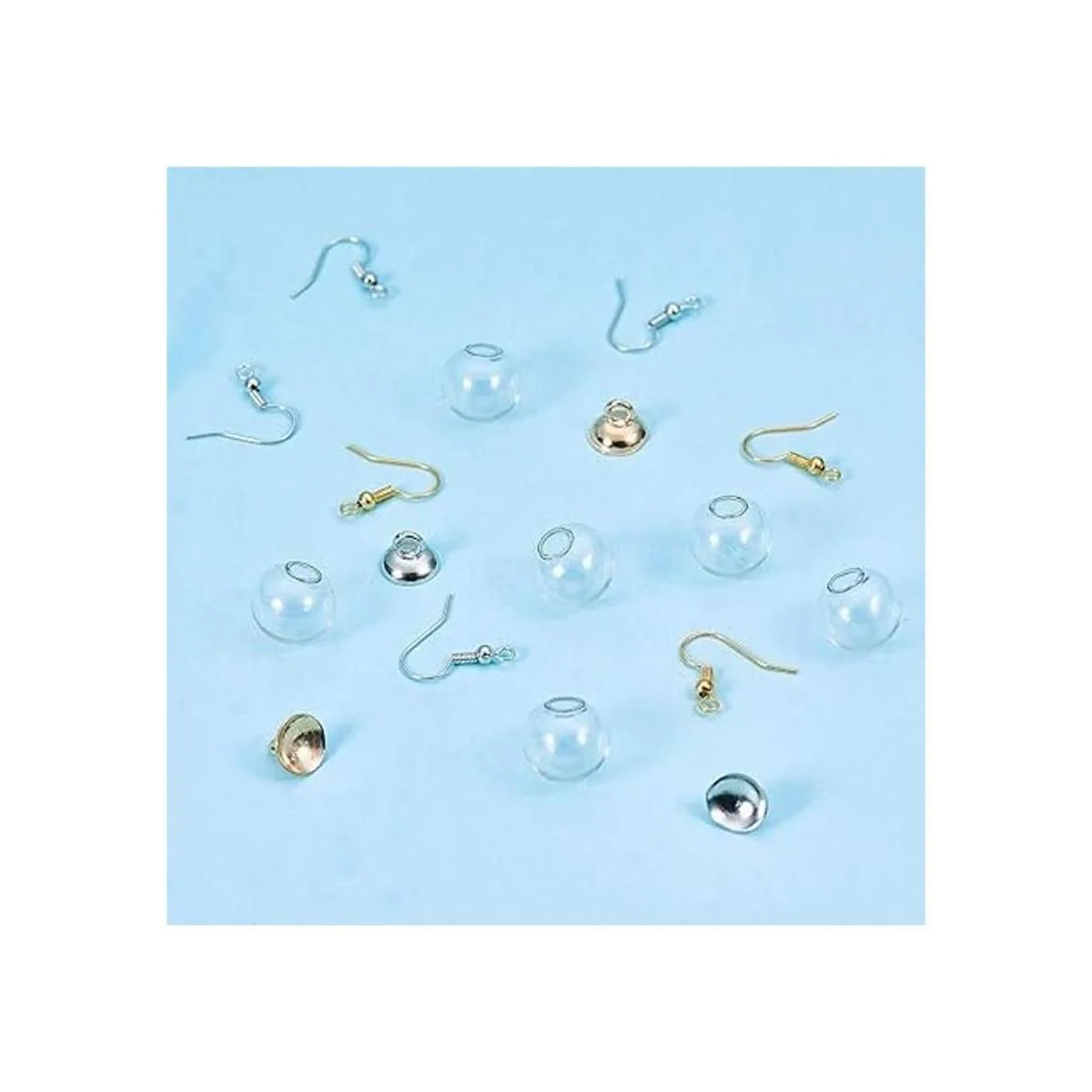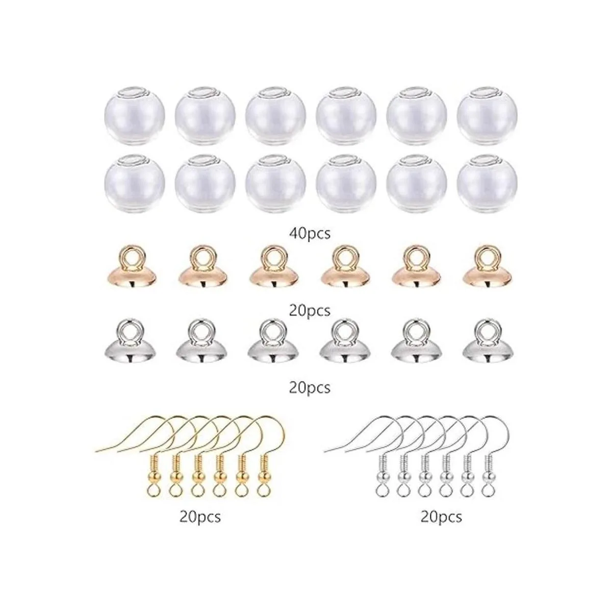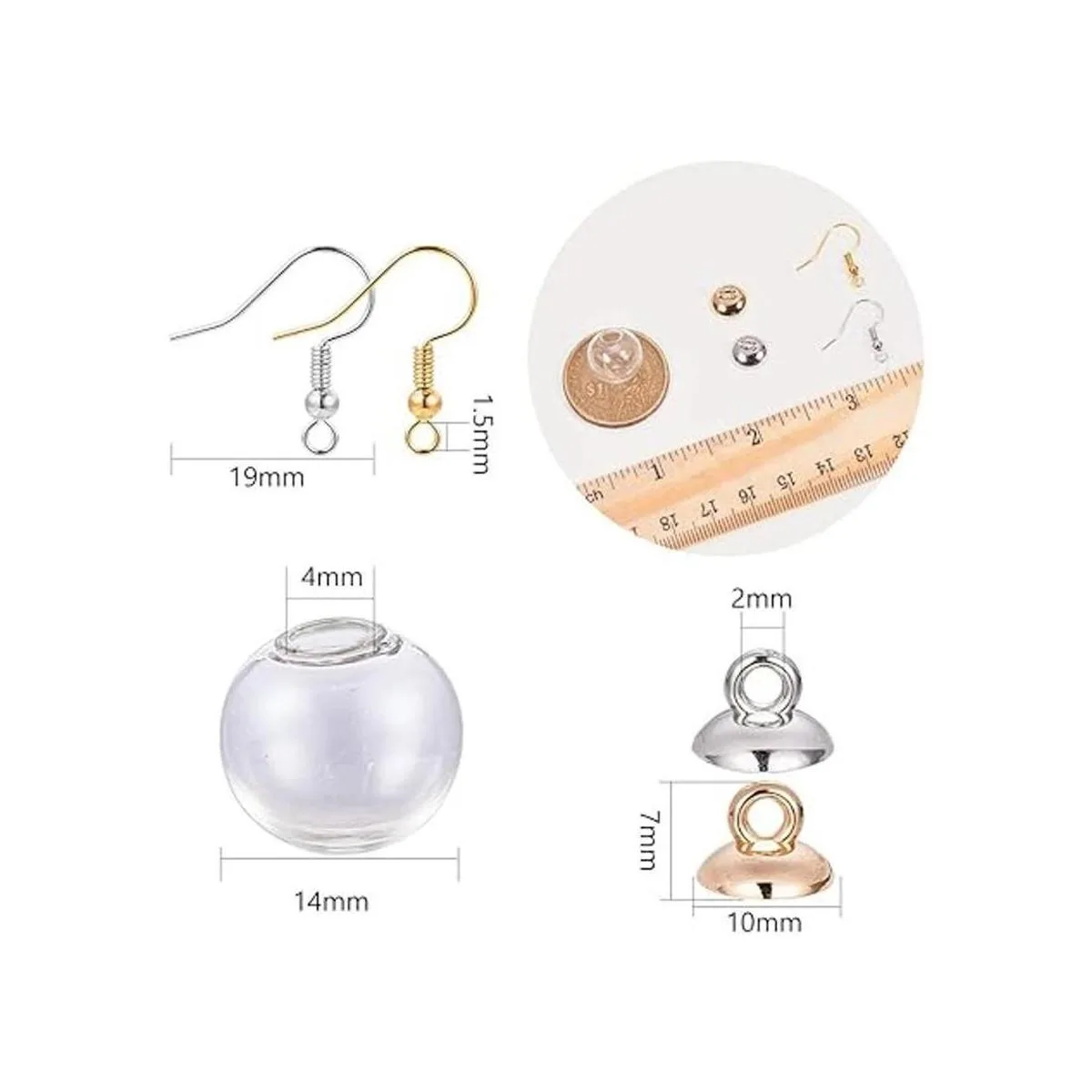 El paquete incluye: 40 botellas de cristal transparente; 40 tapas plateado y dorado, 20 piezas/color; 40 ganchos de latón para pendientes plateado y dorado, 20 piezas/color; 1 caja de plástico de 4.6 x 2.8 x 1.4 in.