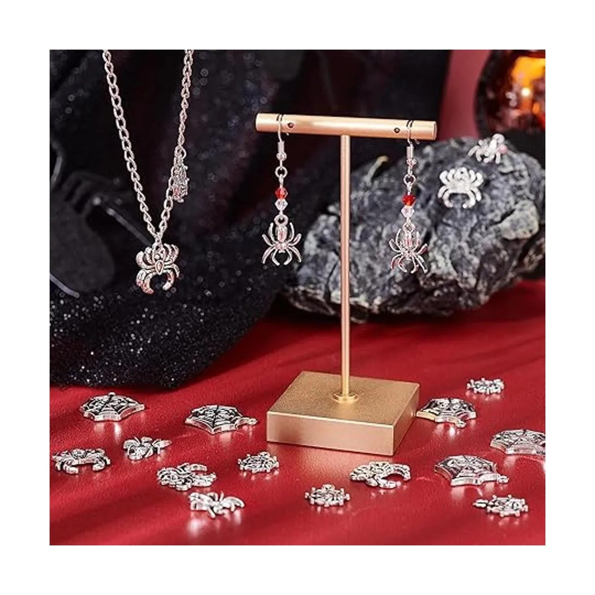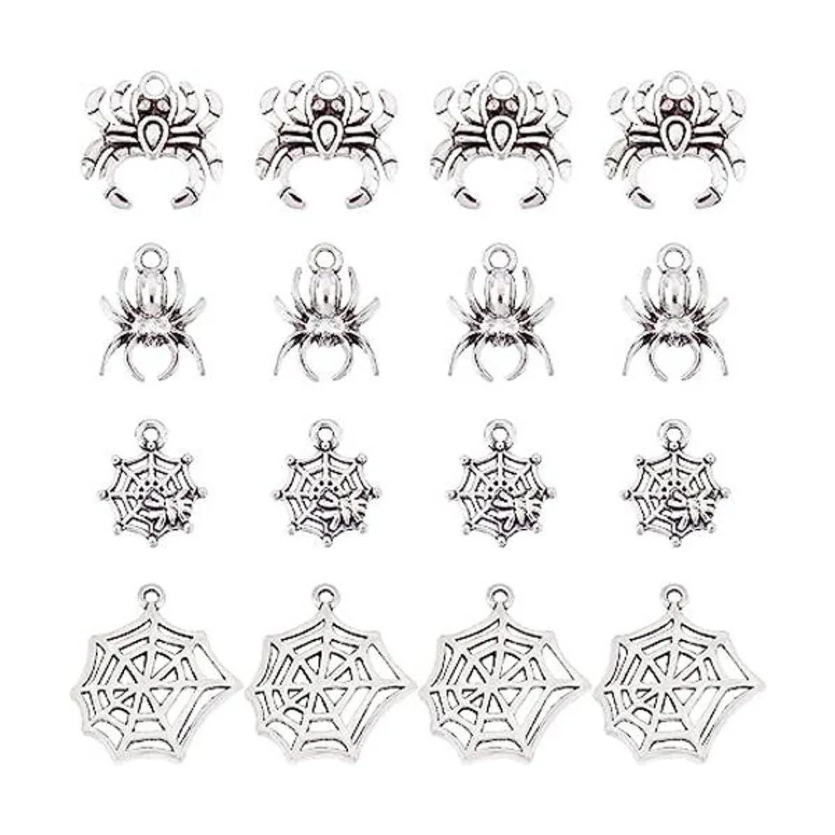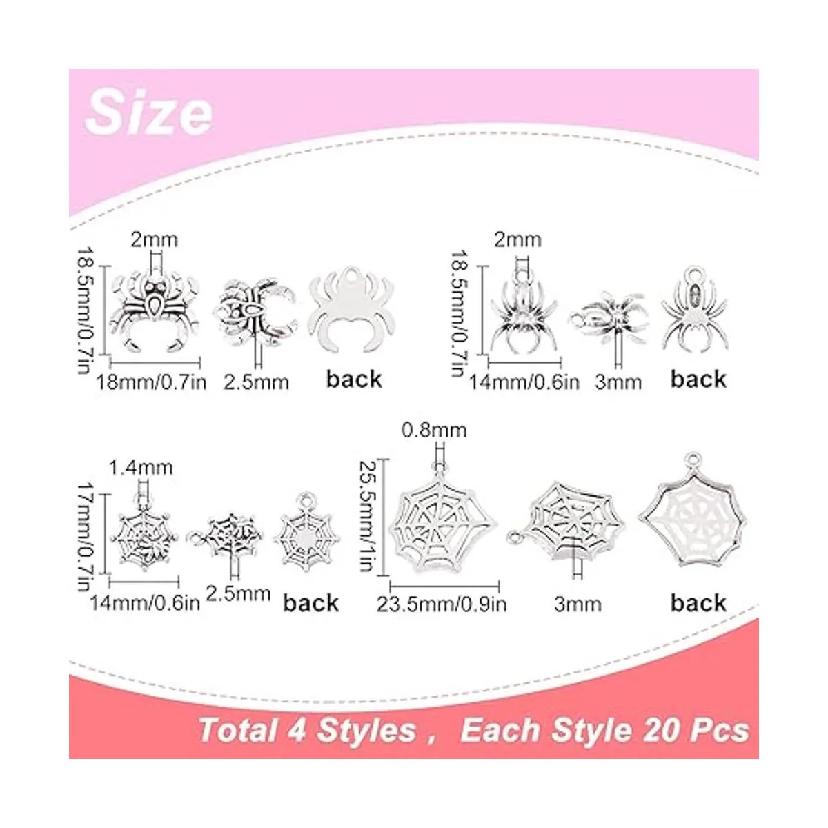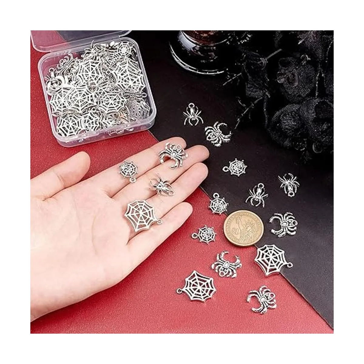 SUNNYCLUE 1 caja de 80 dijes de araña de 4 estilos de estilo tibetano de Halloween para hacer joyas, dijes de telaraña de aleación, aretes, collares, pulseras, suministros de decoración de Halloween, manualidades, manualidades, mujeres adultas