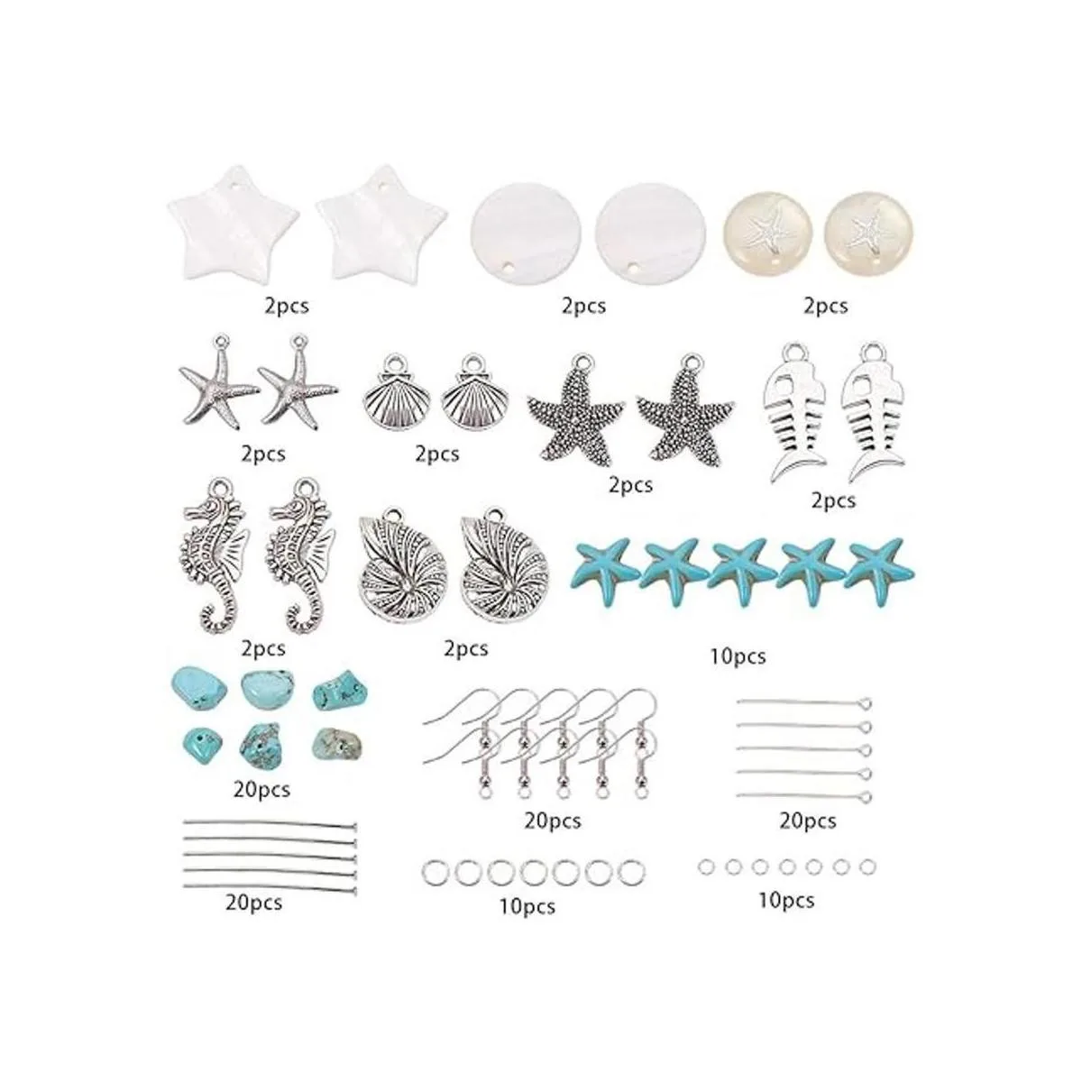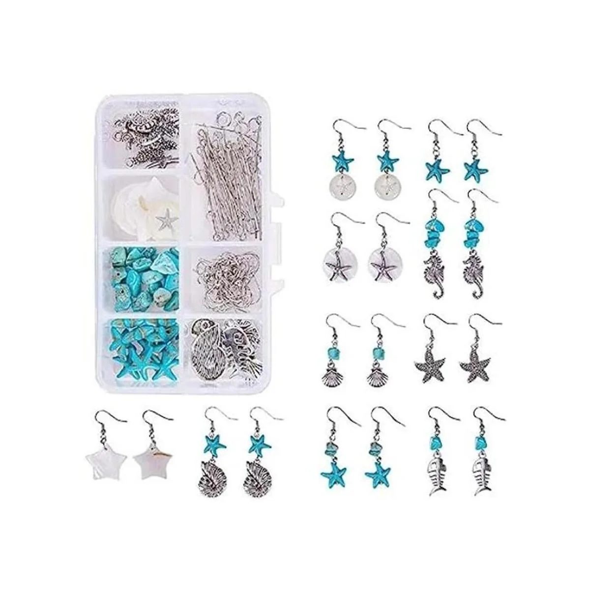 SUNNYCLUE 1 caja DIY 10 pares de aretes de concha de caballo de mar turquesa con estrella de mar, kit de fabricación de joyas, suministros de inicio de cuentas para adultos principiantes, gancho de pez, tema de playa del océano, instrucciones idioma español no garantizado