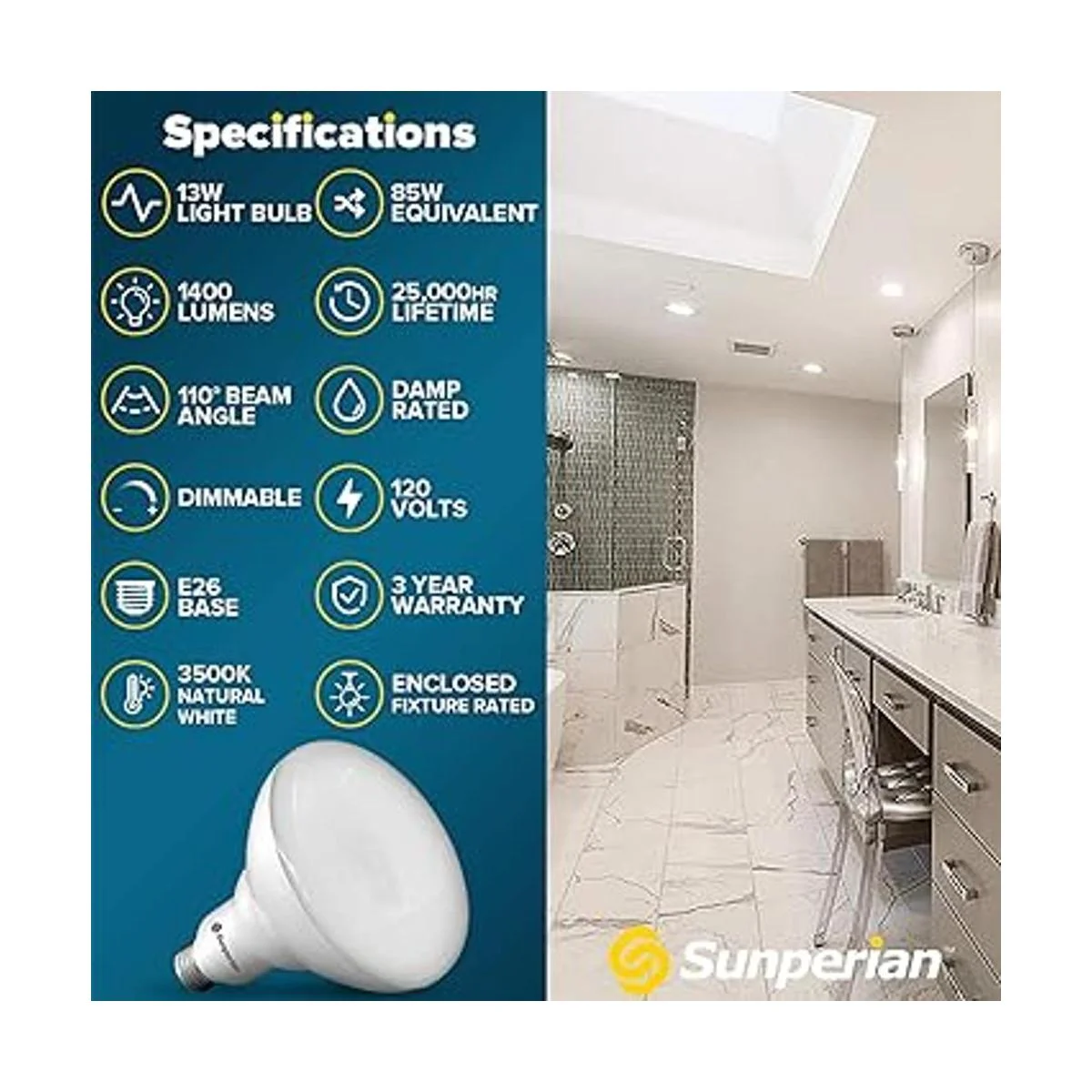 Sunperian BR40 Bombillas LED, 13 W 85 W, 3500 K, blanco natural, 1400 lúmenes, bombillas de inundación regulables para latas empotradas, clasificación de accesorios cerrados, clasificación de humedad, certificación UL, base estándar E26 paquete de 4
