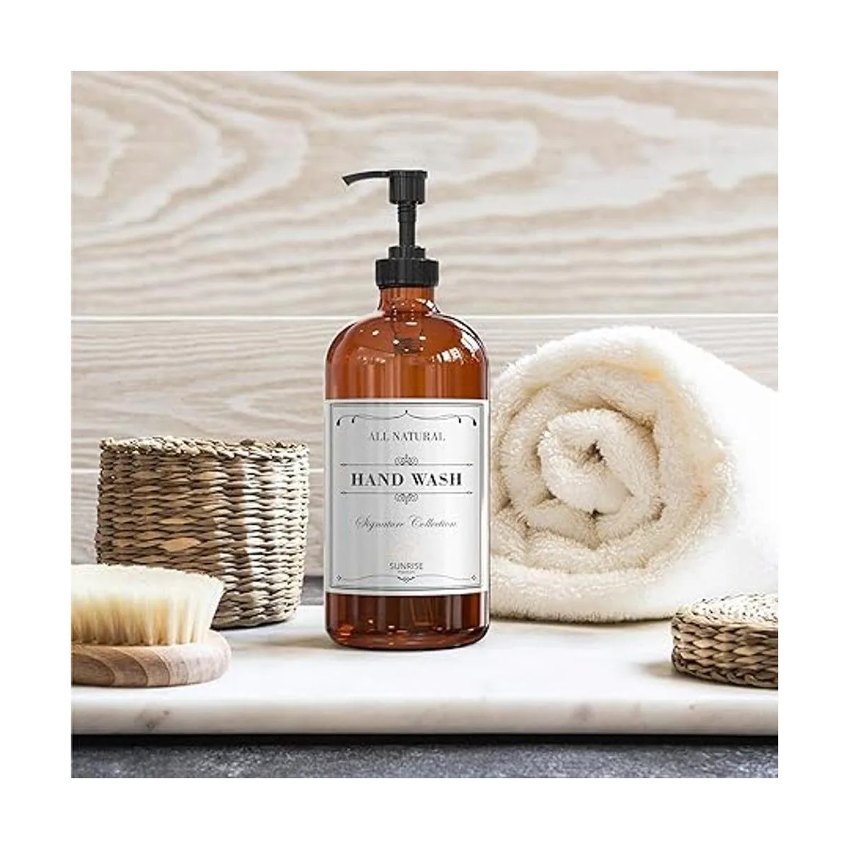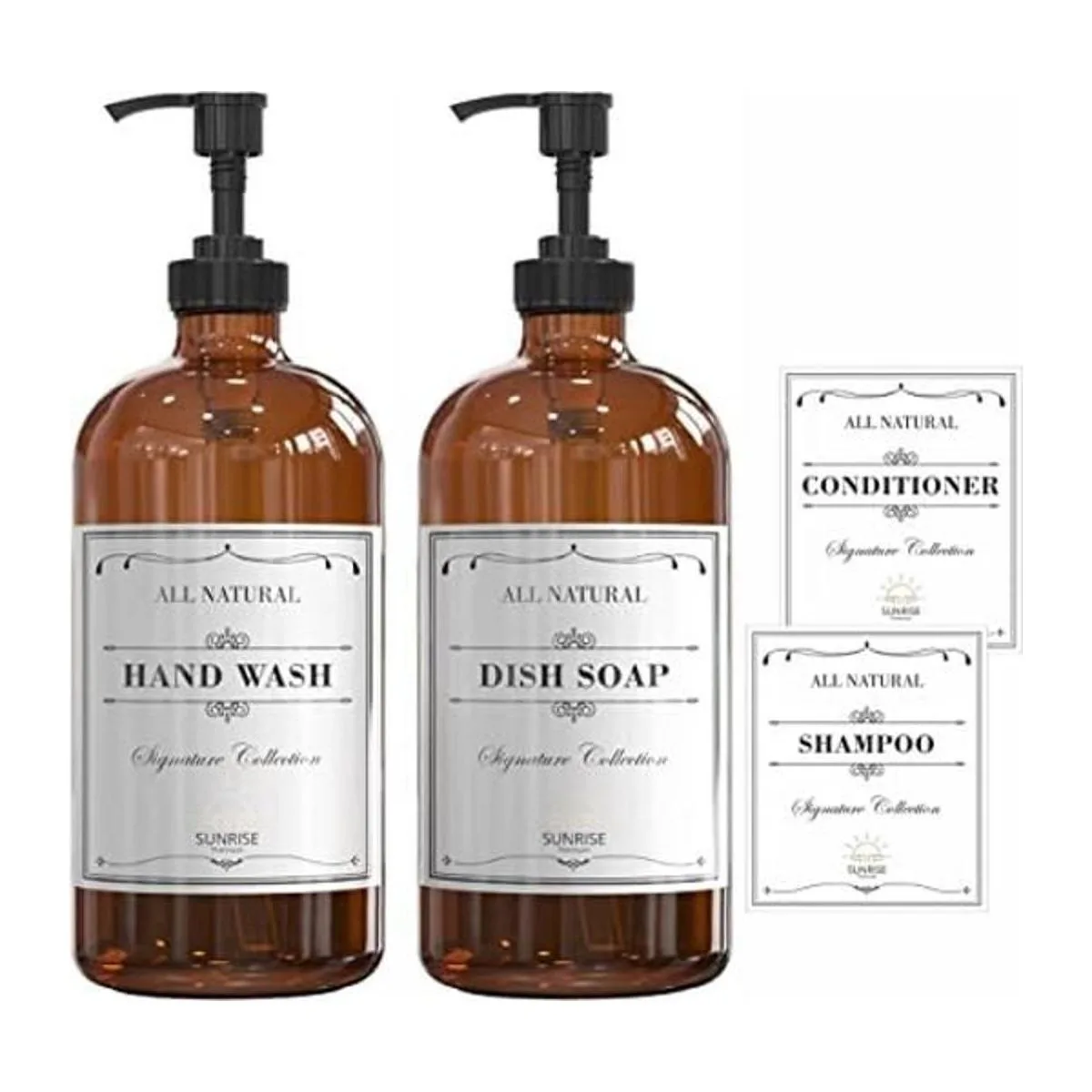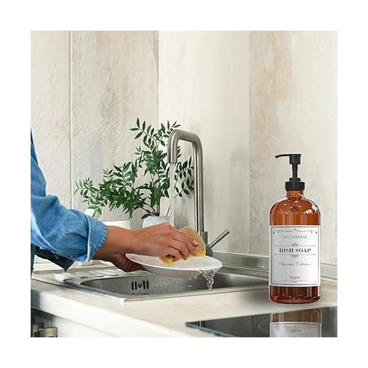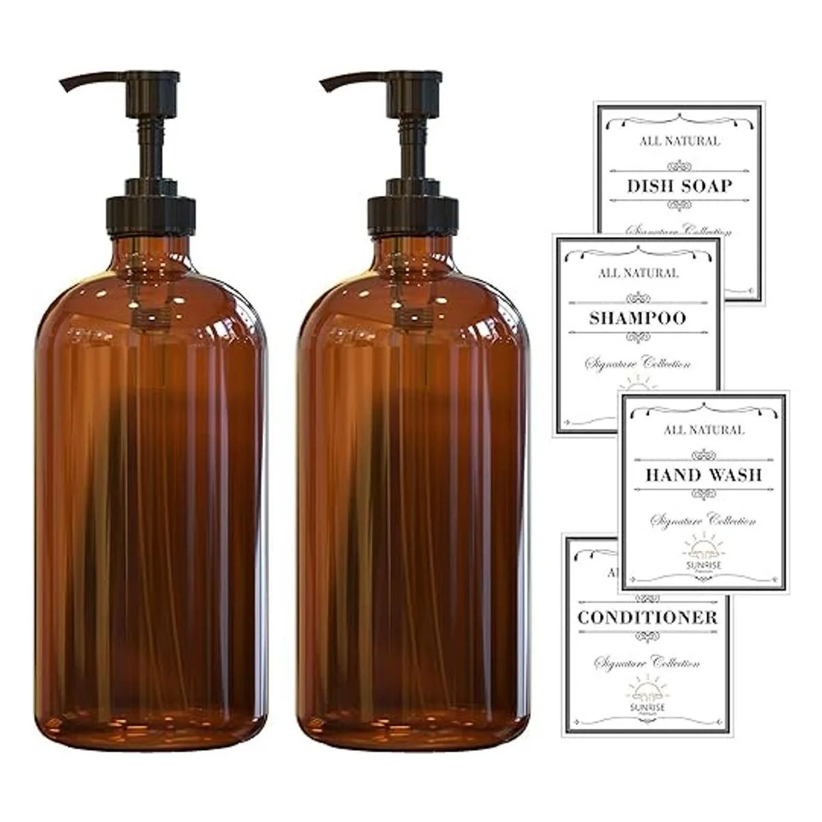 SUNRISE PREMIUM Dispensador de jabón de vidrio ámbar con bomba de plástico, paquete de 2 dispensadores de jabón de manos y platos marrones, recargable, reutilizable, boticario, botella dispensadora de jabón para baño y cocina
