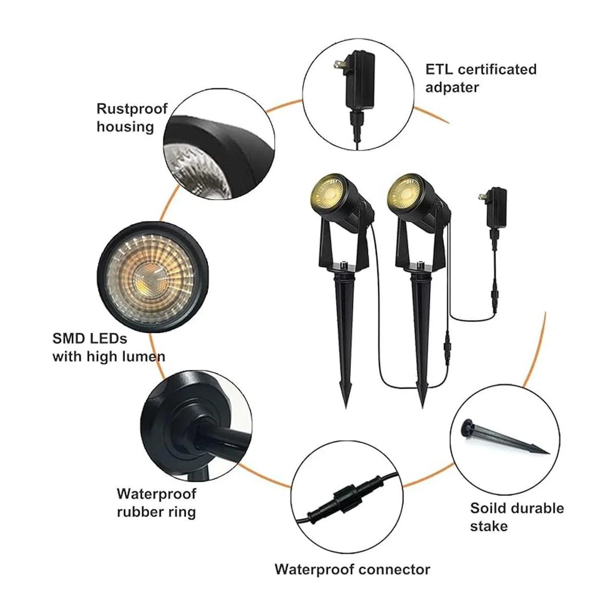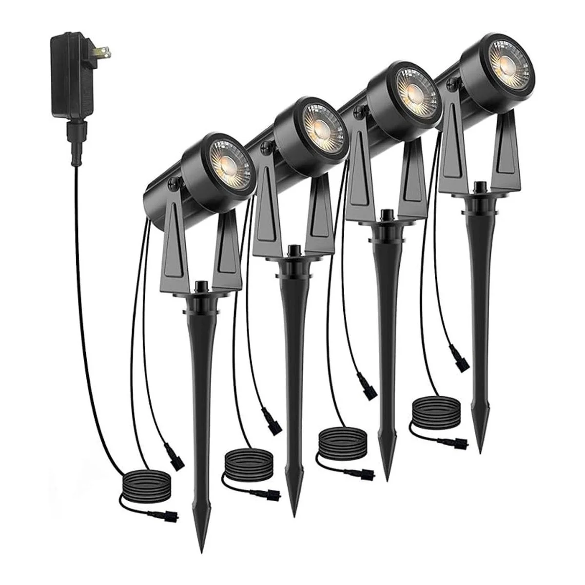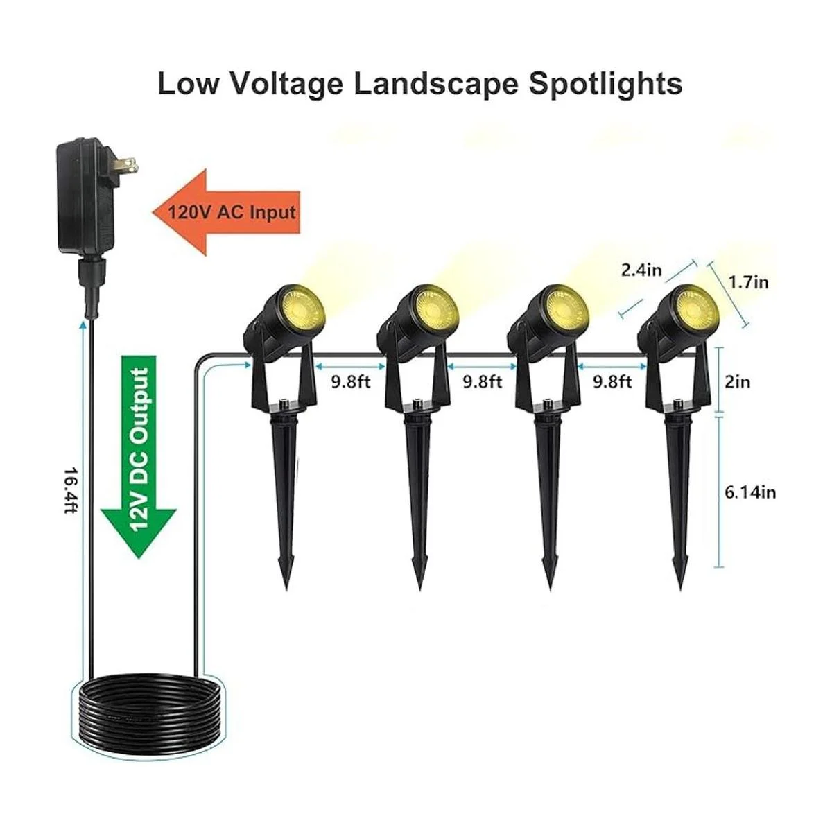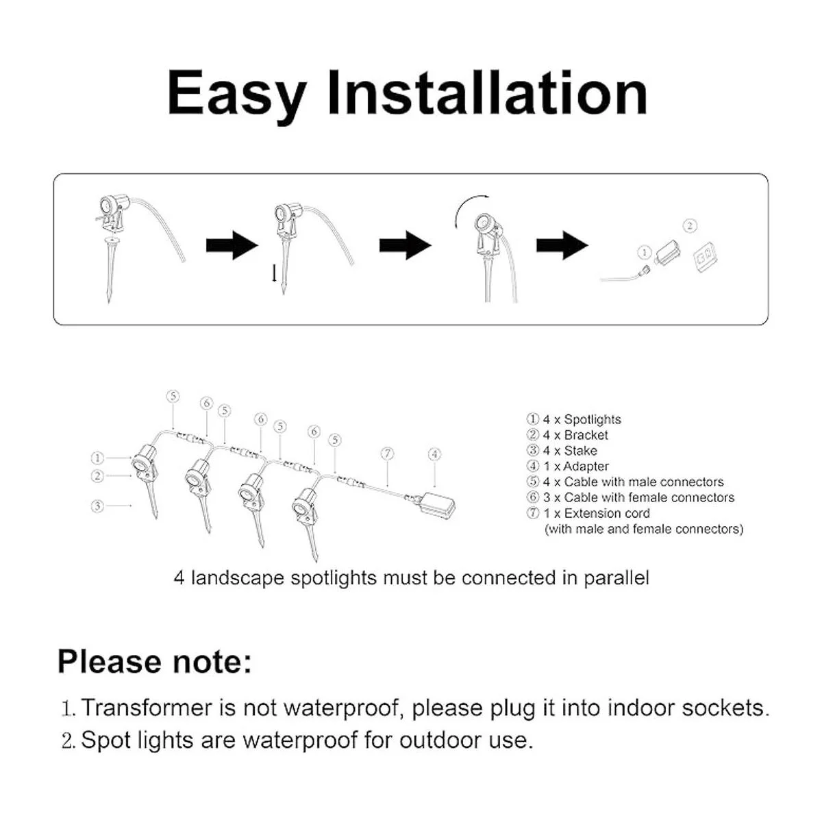 Fácil de instalar: los kits de iluminación de paisaje con cable incluyen 4 focos, 1 transformador y cables para una instalación rápida y fácil para iluminar tu patio. Simplemente pégalo en el suelo o utiliza los tornillos incluidos para montar en la pared, fácil de instalar, sin complicaciones de usar