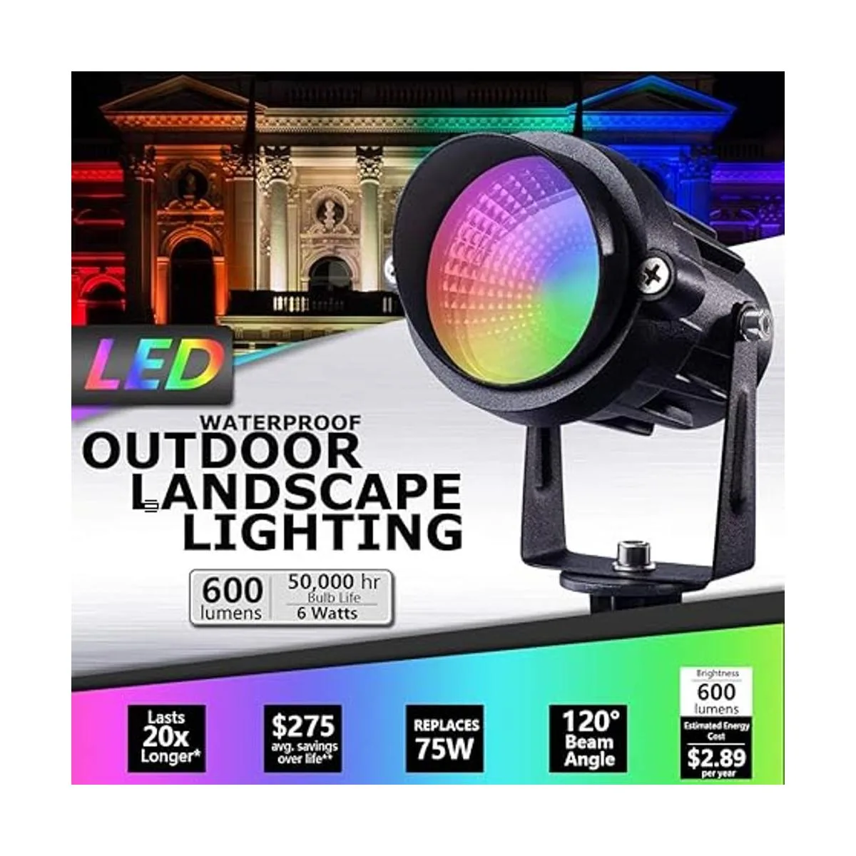 Luz LED de paisaje que cambia de color con control remoto RF: paquete de 2 focos RGB de 6 W, con carcasa de aluminio fundido y estaca de hierro, tienen más de 30.000 horas de vida útil. Incluye 1 control remoto RF la distancia máxima de control es de 50 pies, controla estos focos para cambiar el color/modo. Decora perfectamente tu patio, boda, casa, valla, Navidad, Halloween.