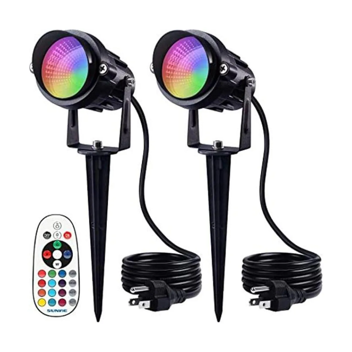 SUNVIE Foco de Halloween para exteriores, 6 W, RGB que cambian de color, luces de paisaje de 120 V, luces LED de punto para exteriores con enchufe y control remoto, iluminación de paisaje impermeable para decoración de jardín, patio, árbol, paquete de 2