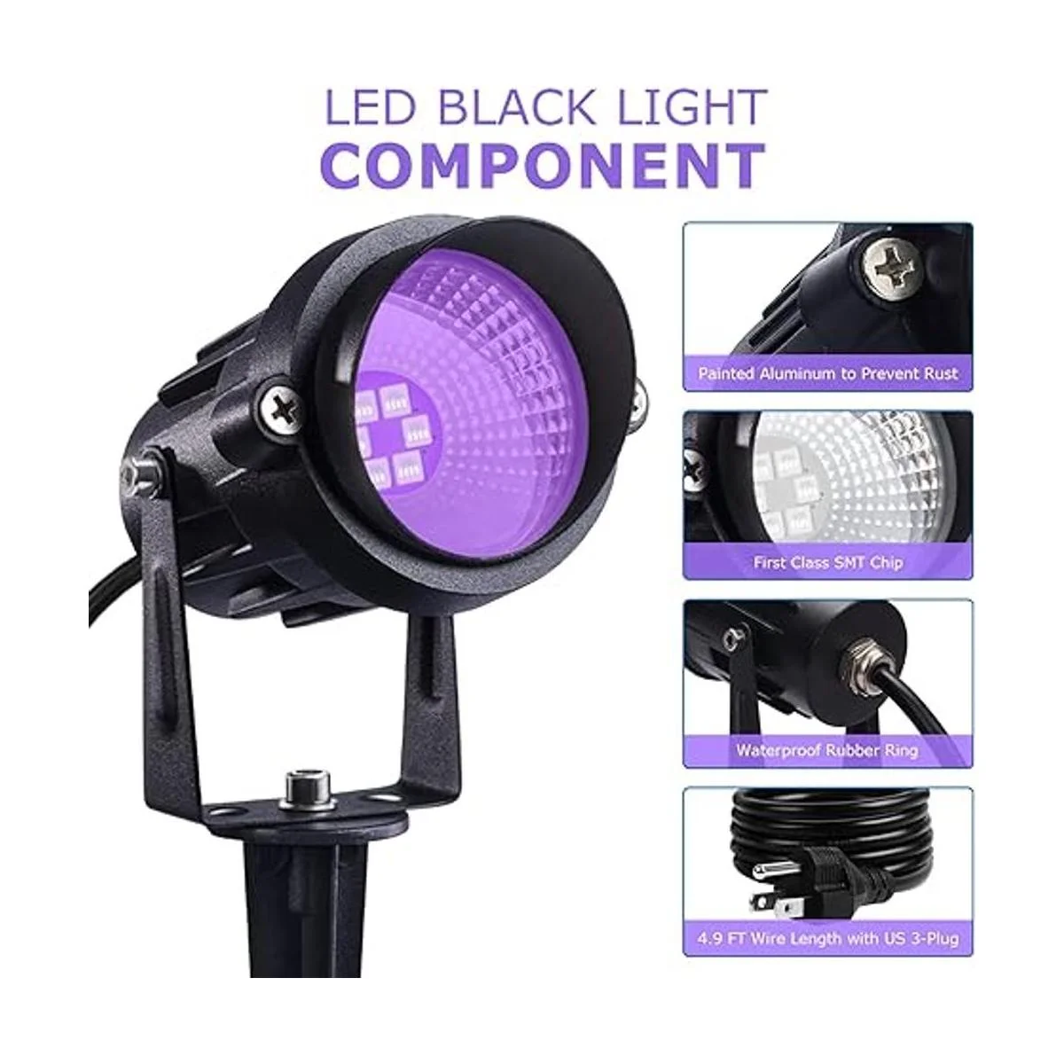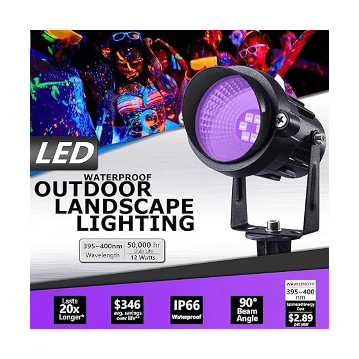 Luz negra mejorada para exteriores: luz negra LED de 12 W con proceso SMT mejorado y chips de alta calidad. 50.000 horas de vida útil, alta eficiencia energética, ángulo de haz de 90 grados, cubriendo un escenario espacioso, patio u otros lugares de fiesta al aire libre. Longitud de onda: 395400 nm.