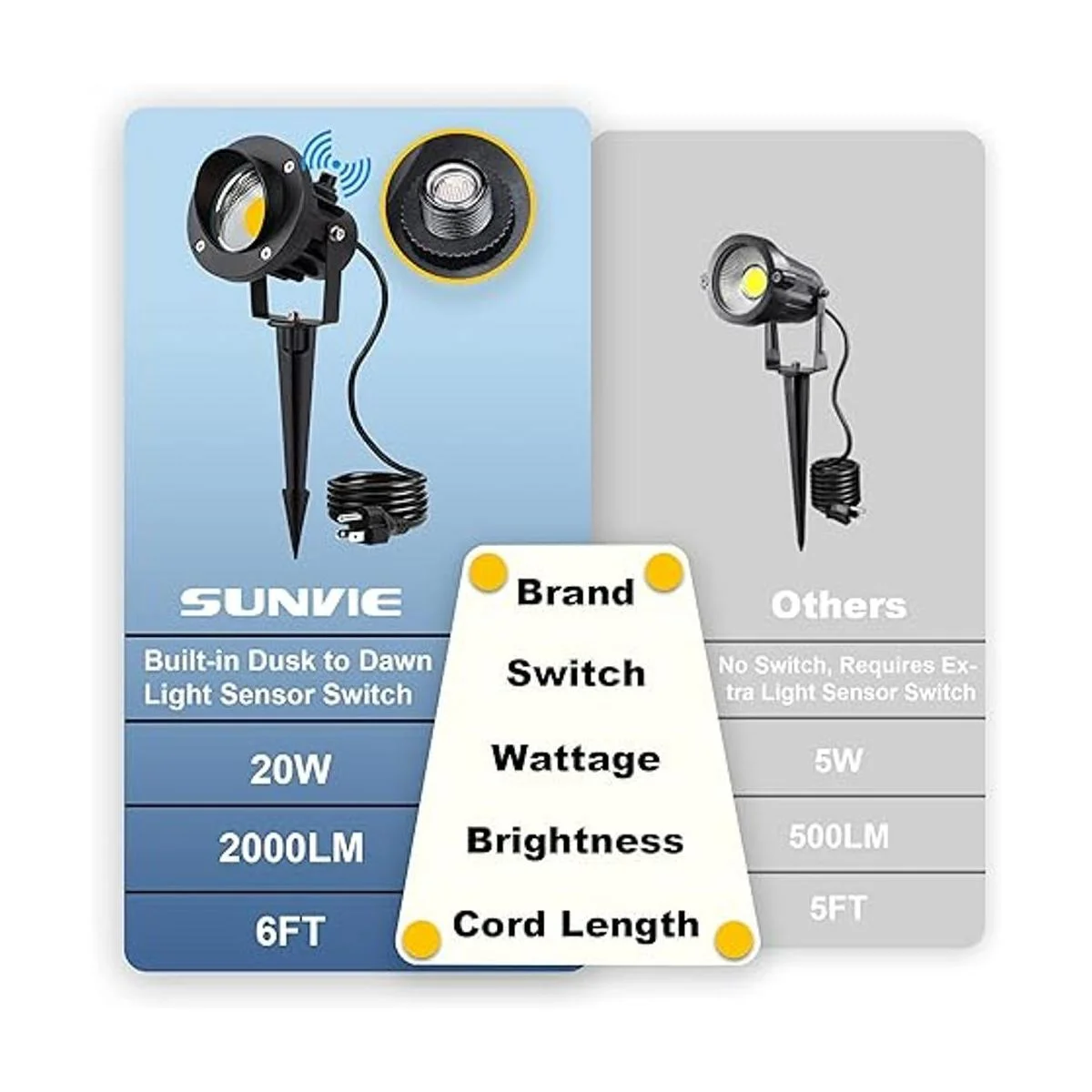Versión mejorada del sensor de luz del anochecer al amanecer: sensor fotoeléctrico integrado, el foco LED para exteriores se enciende automáticamente al anochecer y se apaga al amanecer. Ilumina tu hermoso paisaje cada noche.