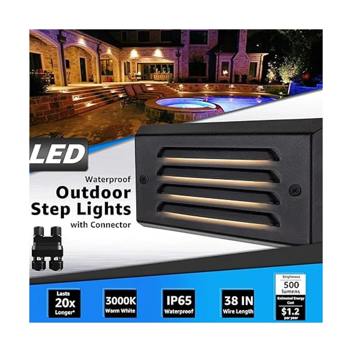 Funcionamiento seguro: voltaje de funcionamiento de 1224 V CA/CC, sin riesgo de descarga eléctrica y ahorro de energía. Las luces de escalera para exteriores con cable ETL de 3.2 pies deben ser alimentadas por transformador de bajo voltaje de 12 a 24 V no incluido.