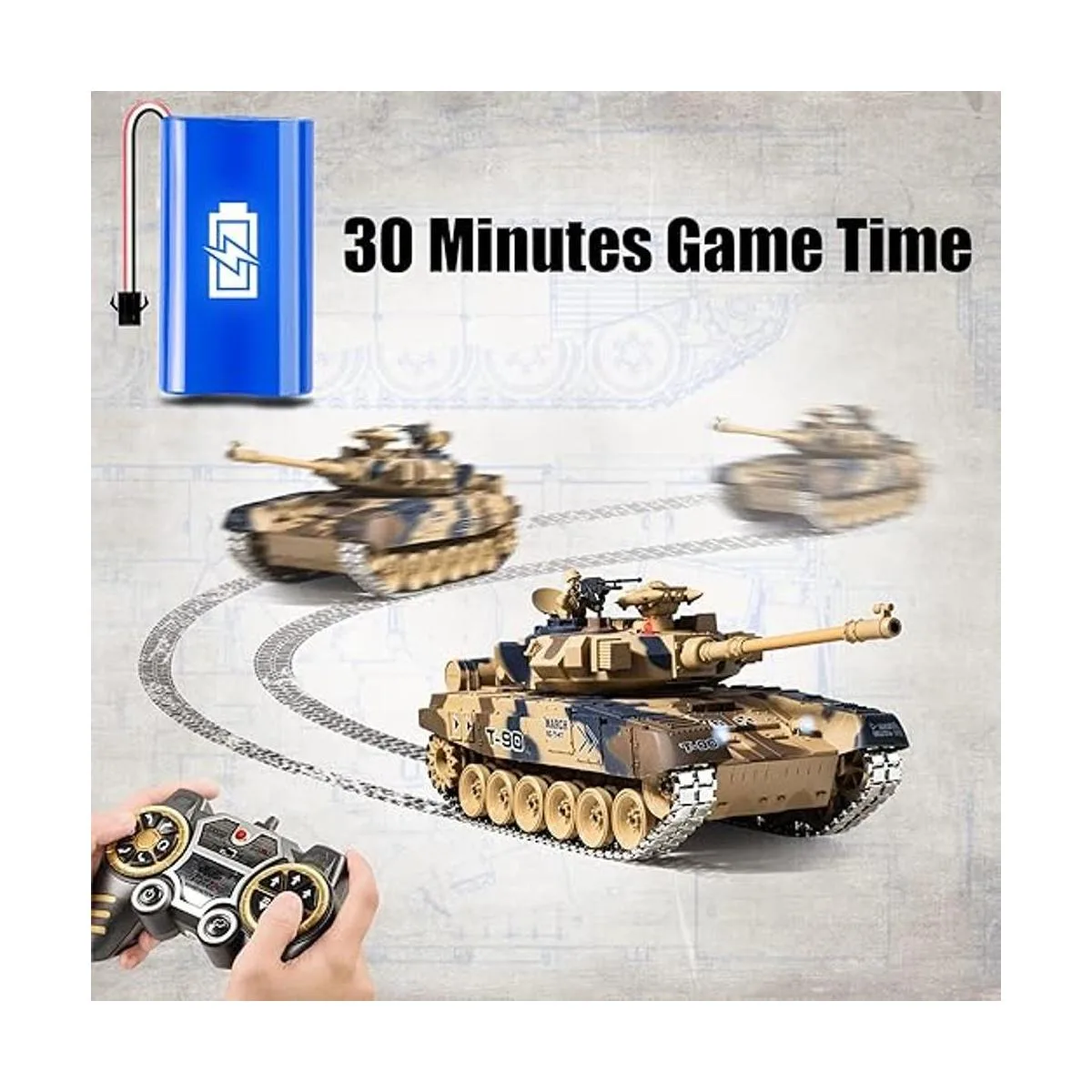 Pistas de metal para tanque RC: el tanque militar ruso T90 es pistas de metal para una mejor resistencia al desgaste. Funciones completas de 15 canales: adelante / atrás, giro derecho / izquierdo, giro hacia atrás derecho / izquierdo, giro central a derecha / izquierda; rotación de torreta, bozal hacia arriba/abajo, dispara balas suaves y BB.