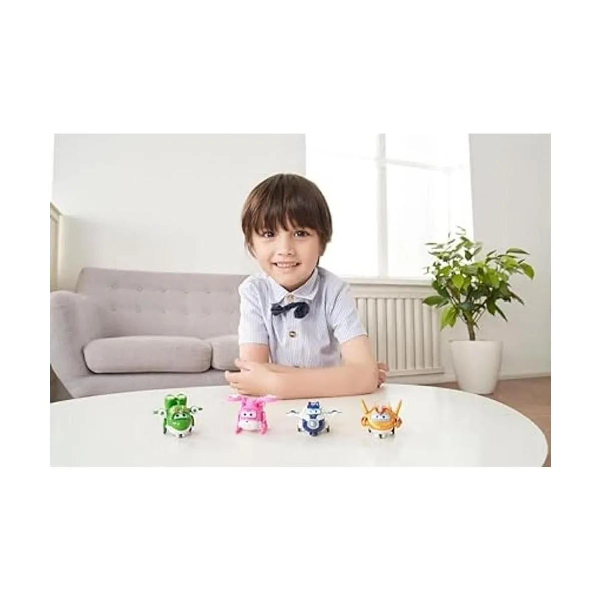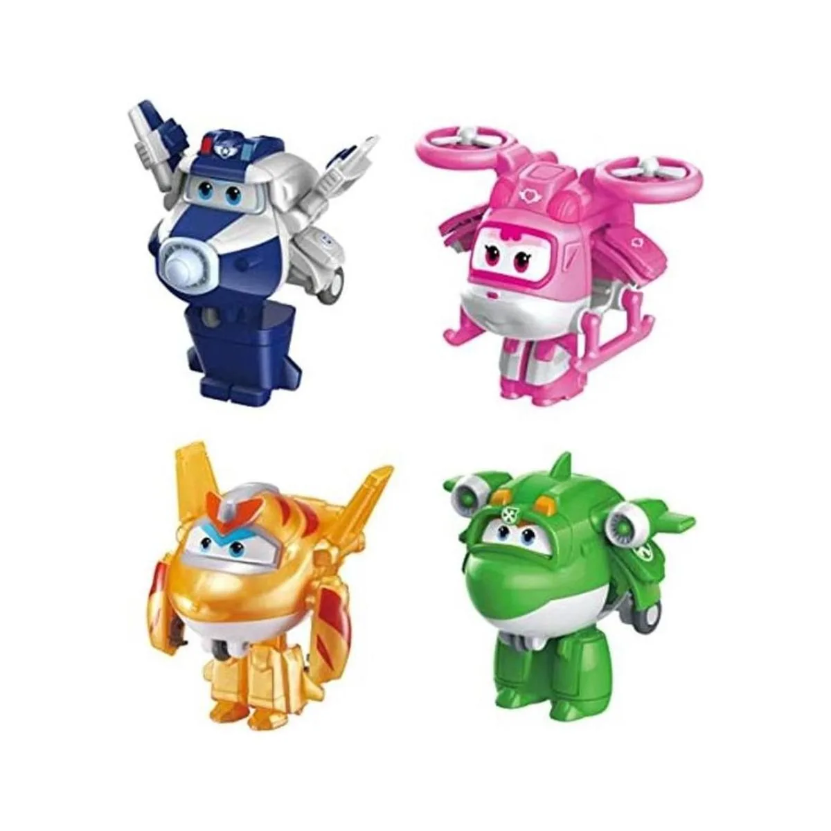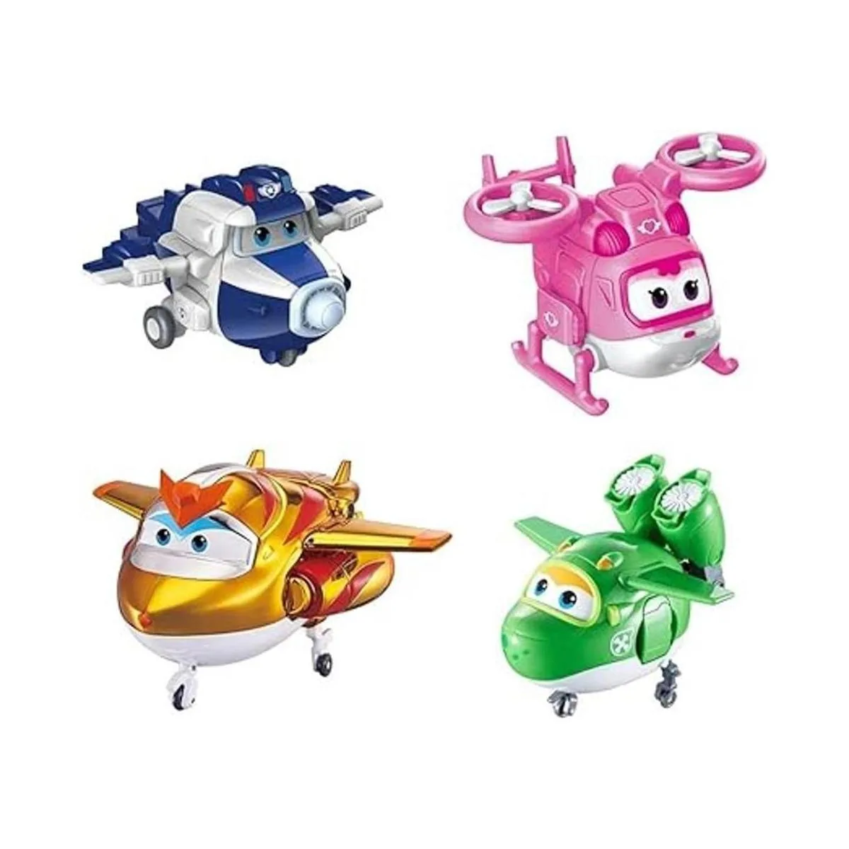 Super Wings TransformaBot de 2 pulgadas, paquete de 4 unidades, Paul sobrecargado, Dizzy, Golden Boy, Mira, juguetes de avión, mini figuras de acción, juguetes preescolares para niños de 3, 4 y 5 años, juguetes transformadores, regalos de cumpleaños para niños