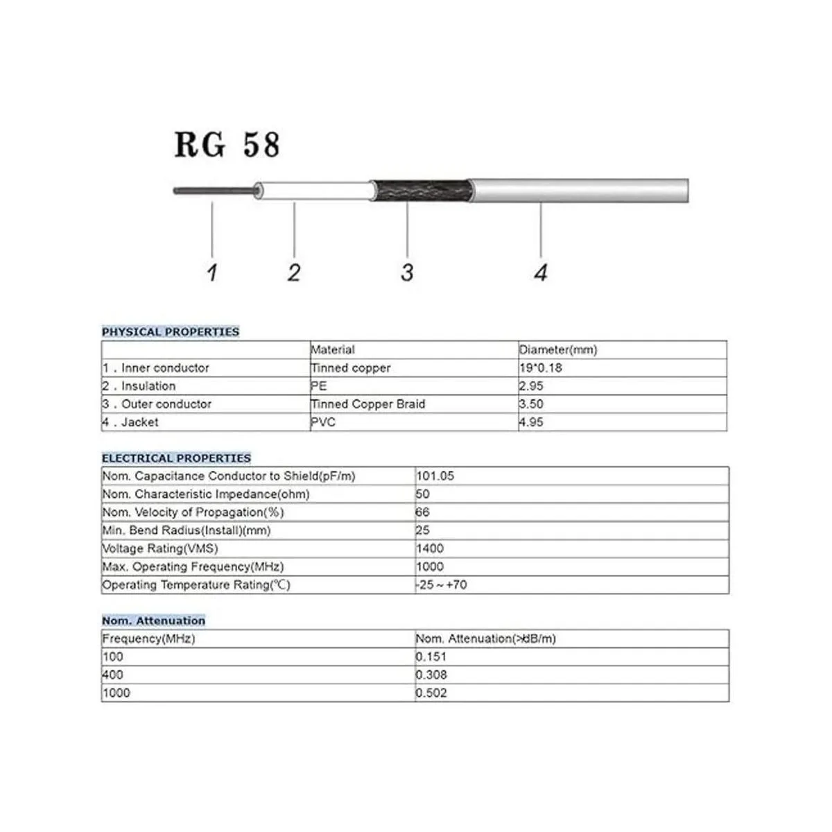 Conector: cobre, alta calidad; Cable: cable coaxial RG58; longitud: 118.1 in; impedancia: 50 ohmios