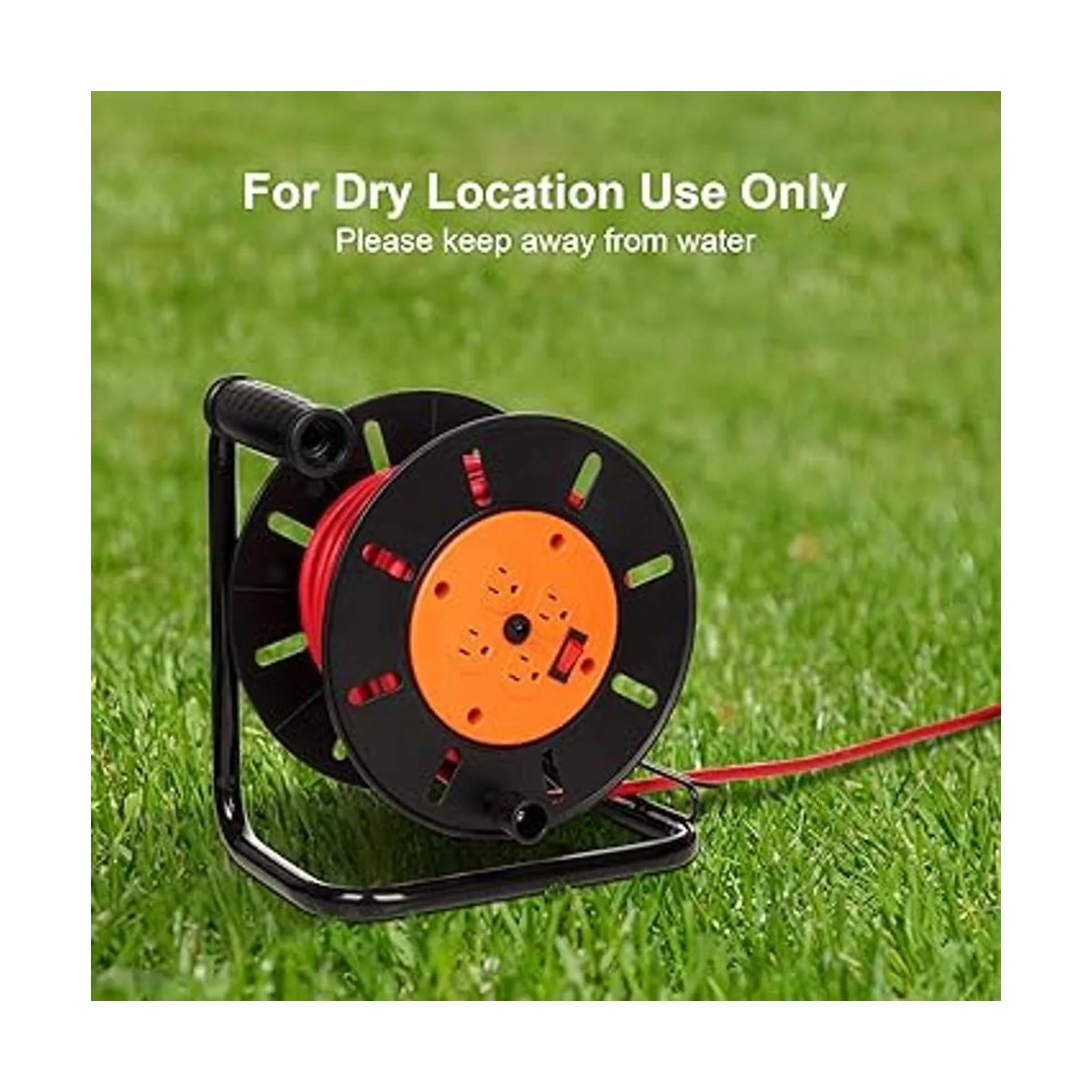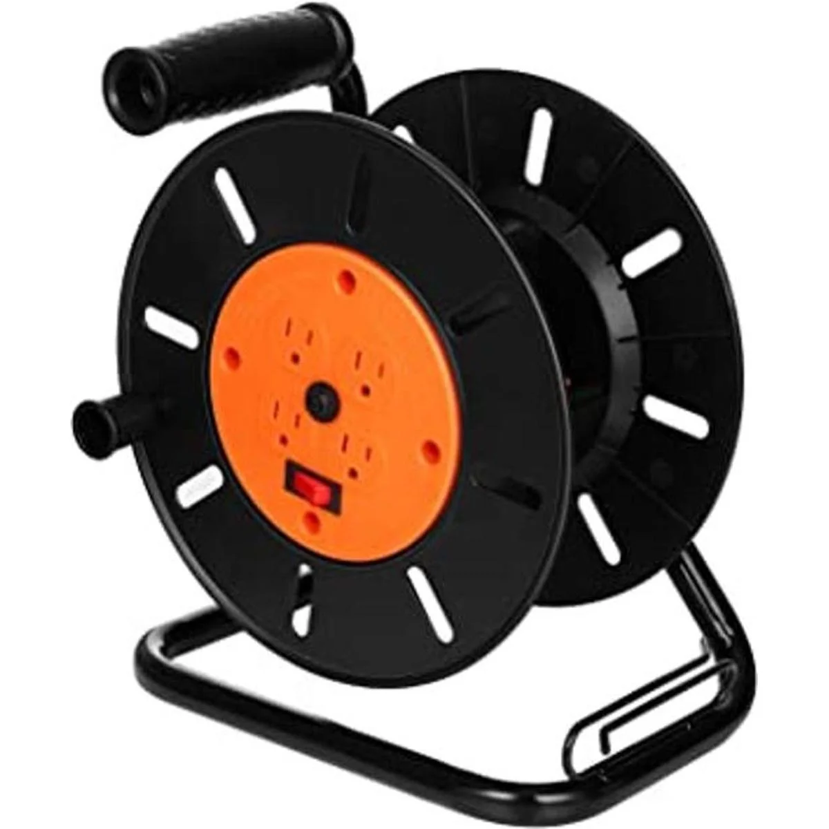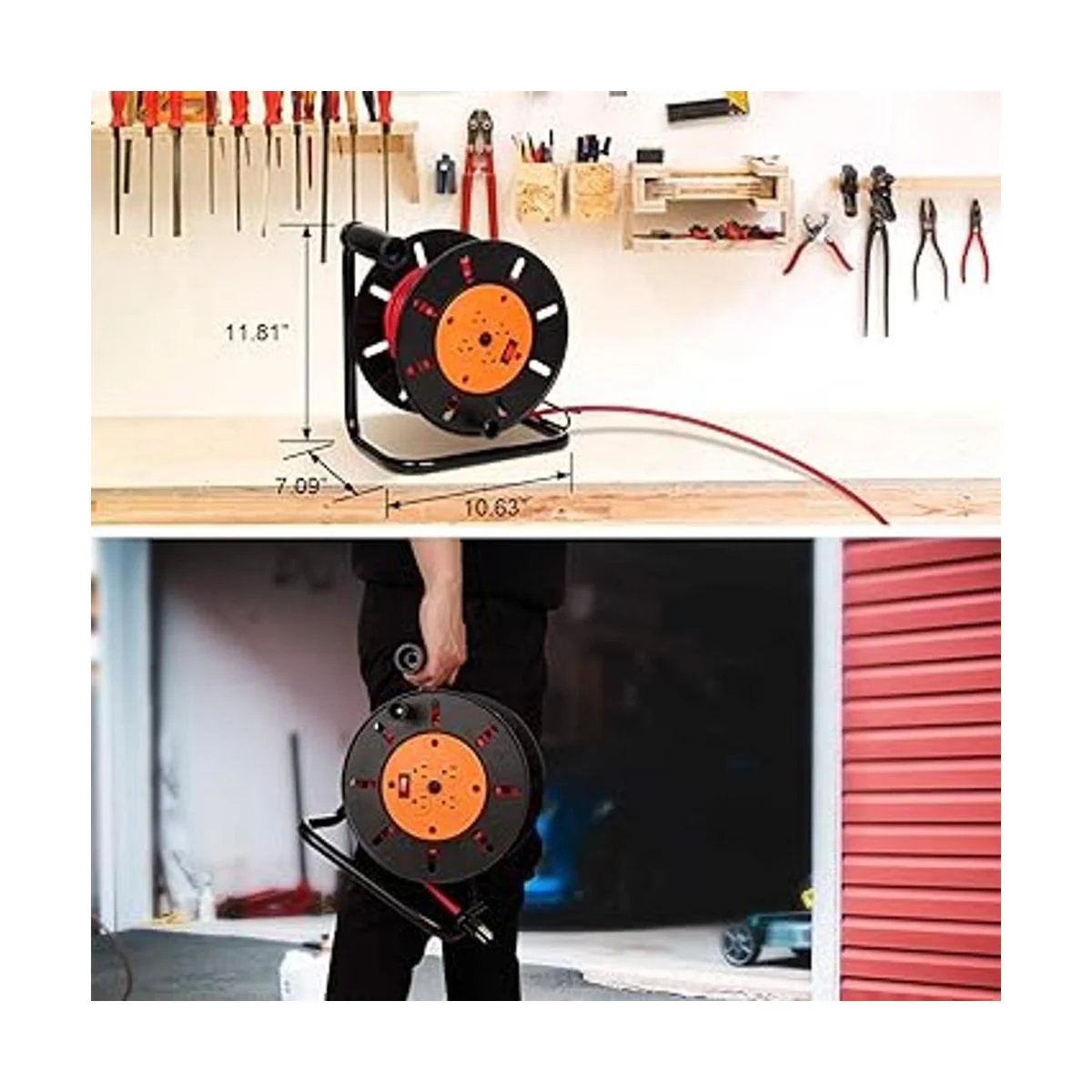 Capacidad de soporte de cable de extensión portátil: el carrete de almacenamiento de cable de extensión tiene capacidad para hasta 100 pies de cable de alimentación de calibre 16/3, 14/3 o 75 pies de cable de alimentación de calibre 12/3; este carrete de almacenamiento de cable con un asa de transporte de metal rígido es una opción perfecta para cada hogar, patio, garaje o taller; añade más eficiencia a las tareas diarias; solo para uso en lugares secos