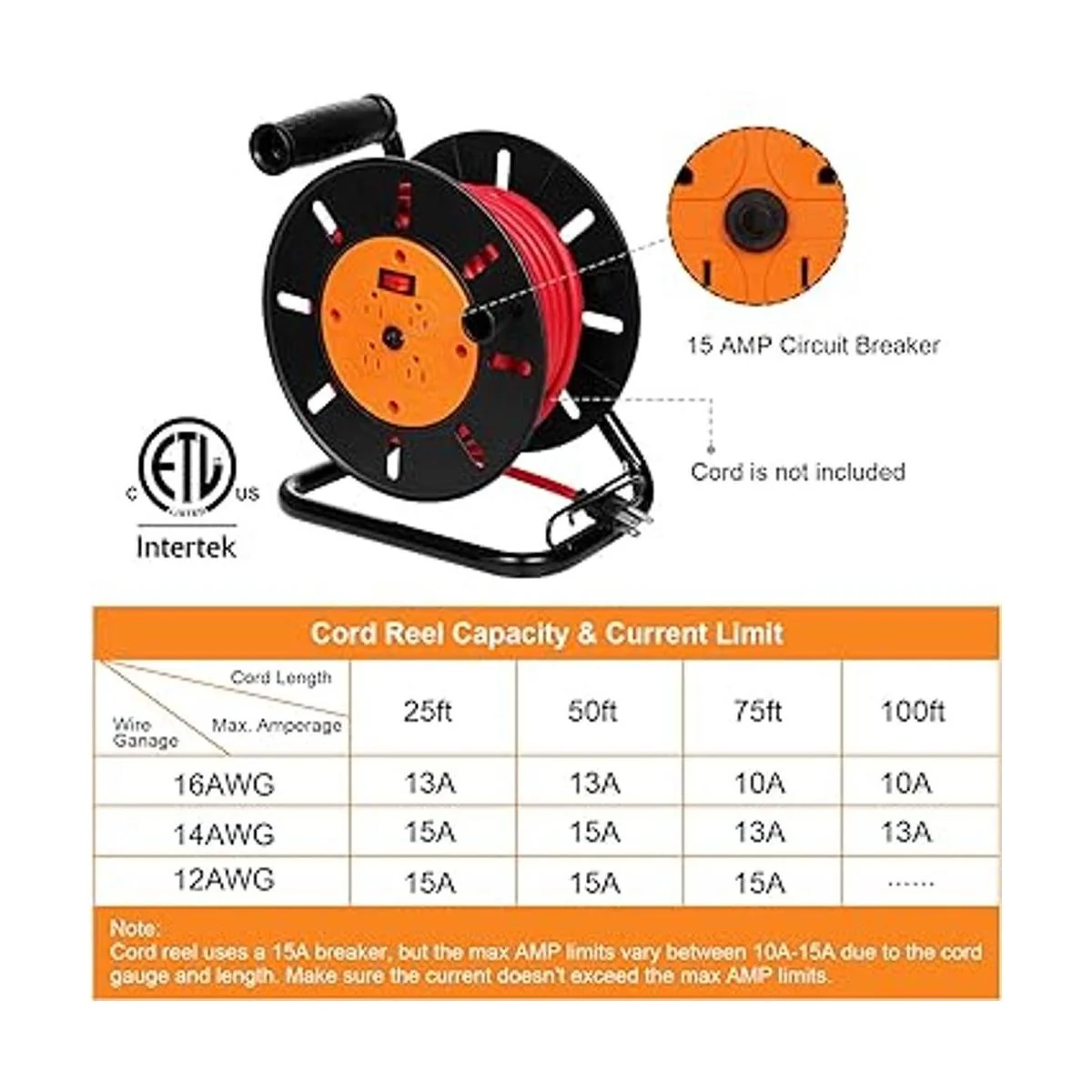 Suraielec Carrete de cable de extensión con 4 tomas, disyuntor de 15 amperios, soporte de metal resistente, capacidad para cables de 100 pies 163, 143 o 75 pies 123, soporte de rodillo de cable eléctrico portátil de manivela vacía con certificación ETL