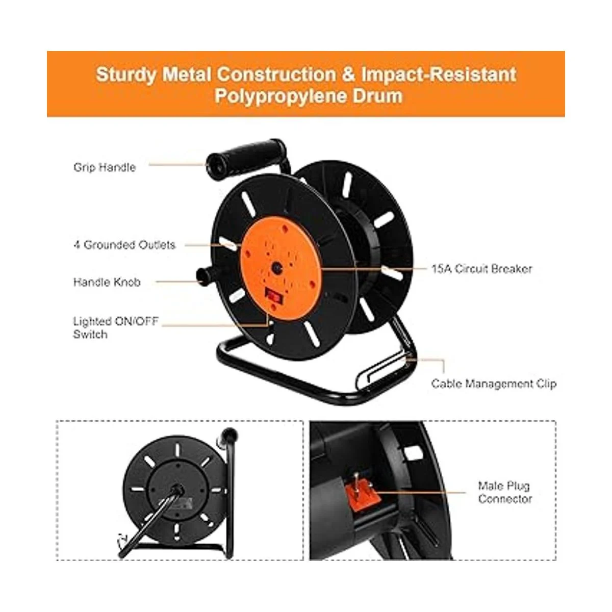 Resistente, duradero y portátil: certificado según ETL; este carrete de cable eléctrico resistente tiene un diseño de tambor abierto de polipropileno resistente a los impactos con asa de transporte de metal rígido y base de acero duradero; lleva la potencia a donde necesites trabajar; el rodillo de cable de extensión es una opción segura y conveniente para muchos tipos de tareas