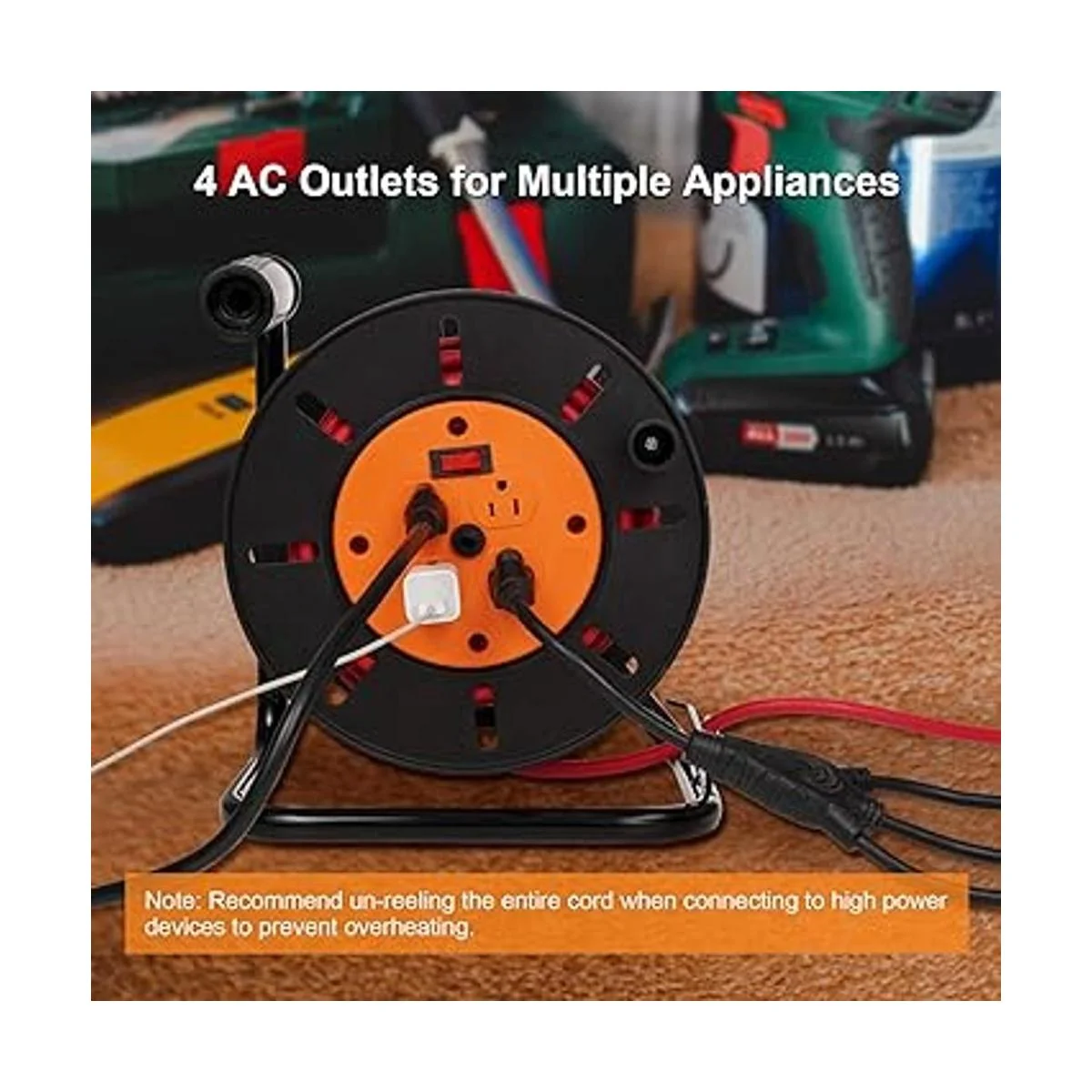 Múltiples tomas de corriente a tierra: el carrete de cable de alimentación viene con 4 tomas de corriente a tierra para que puedas utilizar varias herramientas al mismo tiempo; con el práctico interruptor de encendido/apagado con indicador LED, no tienes que desconectar el cable cada vez que necesites un descanso; también muestra que si está recibiendo energía