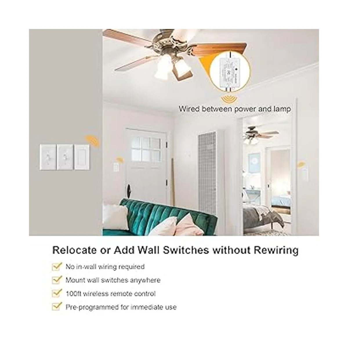 Suraielec Interruptor de luz inalámbrico de 3 vías, sin cableado, sin WiFi, rango de radiofrecuencia de 100 pies, preprogramado, interruptor de pared inalámbrico expandible y kit de receptor, lámpara de control remoto para lámpara, luz de techo, ventilador