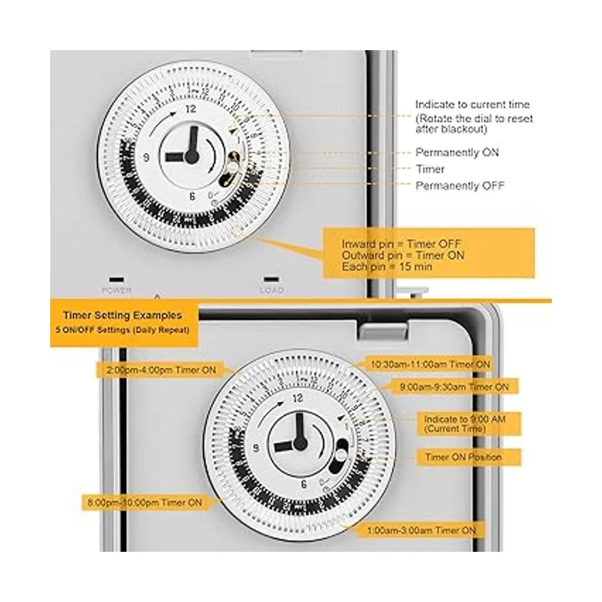 Ajustes de mecanismo simples, claros y fiables: ciclo de repetición diario de 24 horas; el interruptor de temporizador eléctrico con una esfera de reloj en tiempo real y 96 pines intervalo mínimo de 15 minutos puede realizar múltiples ajustes fácil y obviamente; anulación manual disponible; Nota: gira el dial para restablecer el temporizador actual después de un apagado