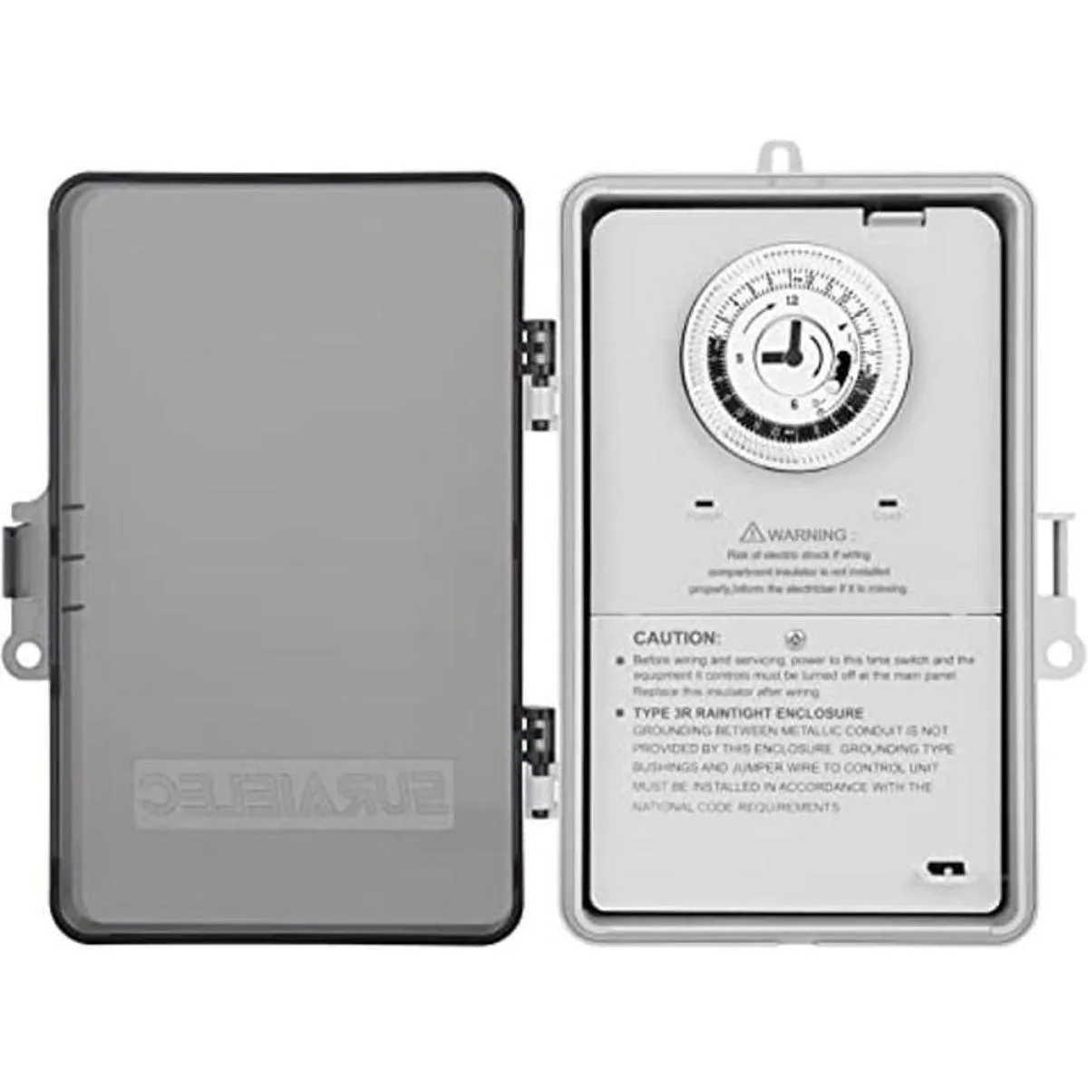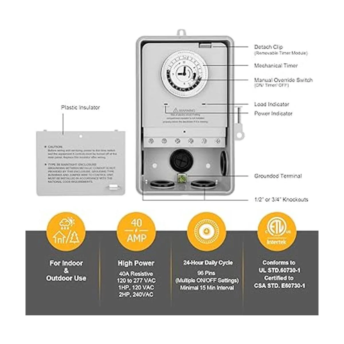 Suraielec Temporizador de piscina, interruptor de temporizador mecánico de ciclo de 24 horas, 40 amperios, 2 HP, 120, 240, 277 VAC, caja de temporizador de control de piscina resistente para interiores y exteriores para bomba de piscina, calentador de agua, spa, aparatos potentes
