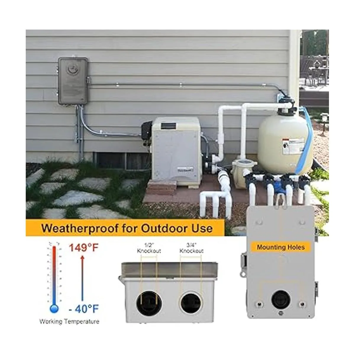 Resistente a la intemperie para uso en exteriores: construcción hermética y a prueba de óxido; el temporizador de la caja de bomba de piscina está hecho de material aislante duradero y ignífugo que resiste la abrasión, la humedad y la luz solar directa; la cubierta de la caja con cerradura protege el temporizador del filtro de piscina contra la lluvia, la nieve y el polvo y resiste la manipulación
