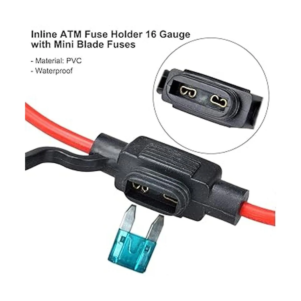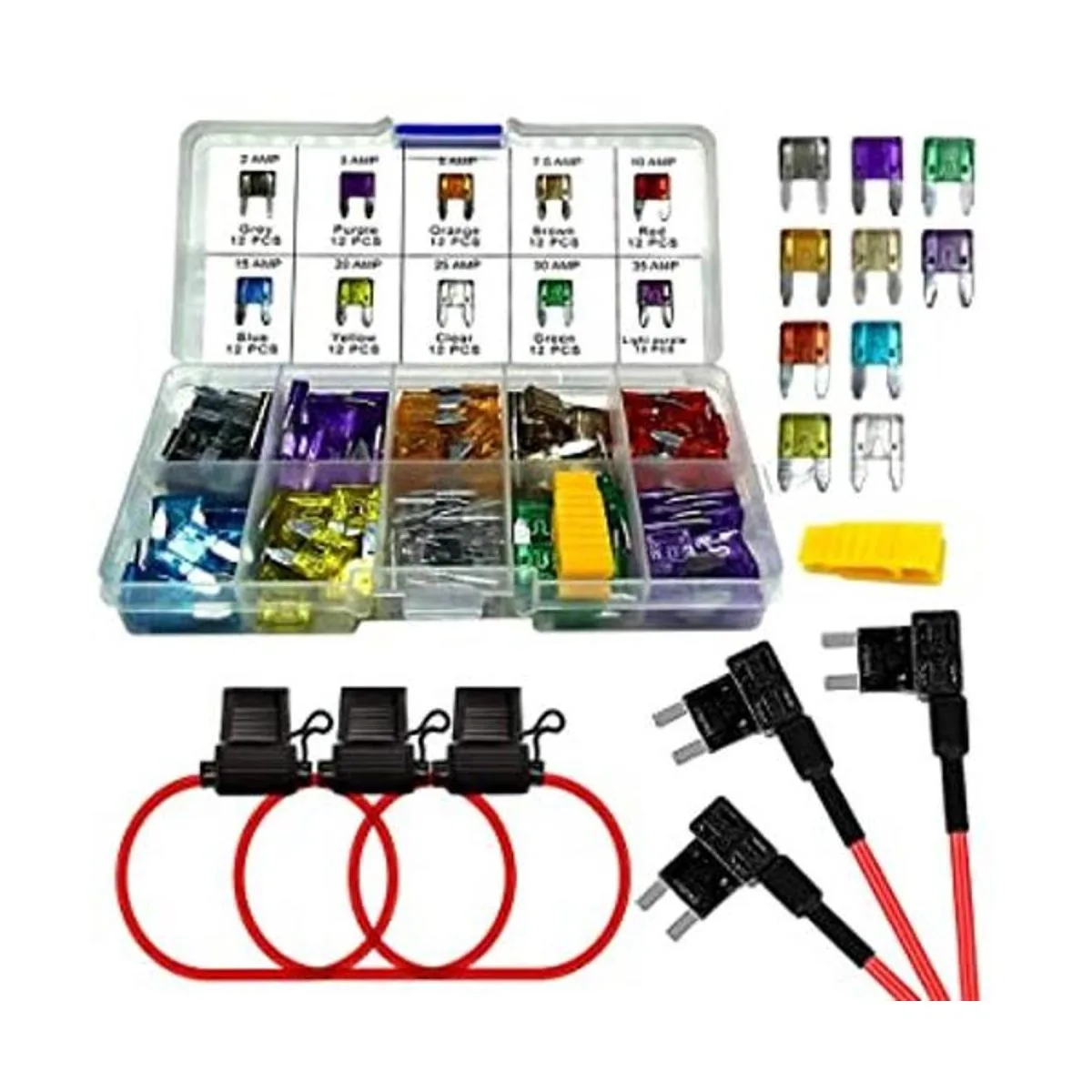 Surtido de fusibles con grifo de fusibles, 120 piezas de mini ATM fusibles de hoja surtidos 2A 3A 5A 7.5A 10A 15A 20A 25A 30A 35A, adaptador de grifo de circuito adicional, soporte de calibre 16 AWG en línea