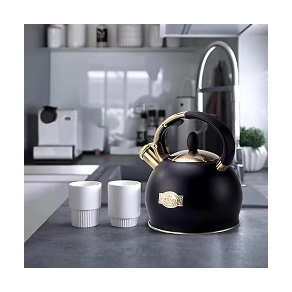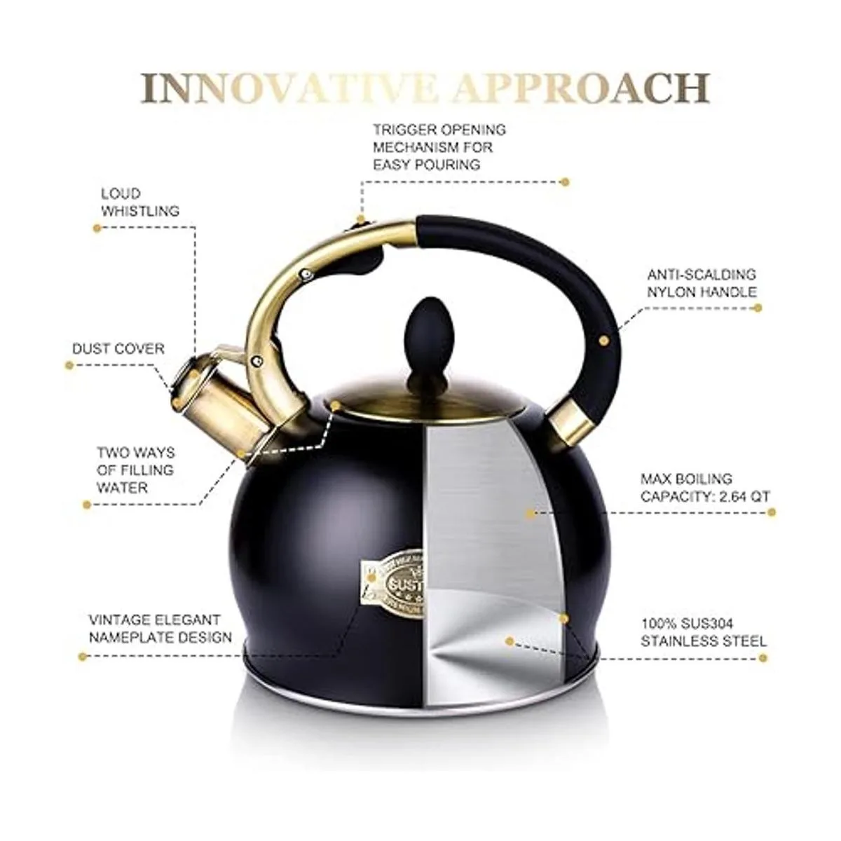 SUSTEAS Tetera silbante de acero inoxidable quirúrgico para la cocina, con mango ergonómico frío al tacto, 1 guante de silicona incluido, 2.64 cuartos 2.5 litros, Negro