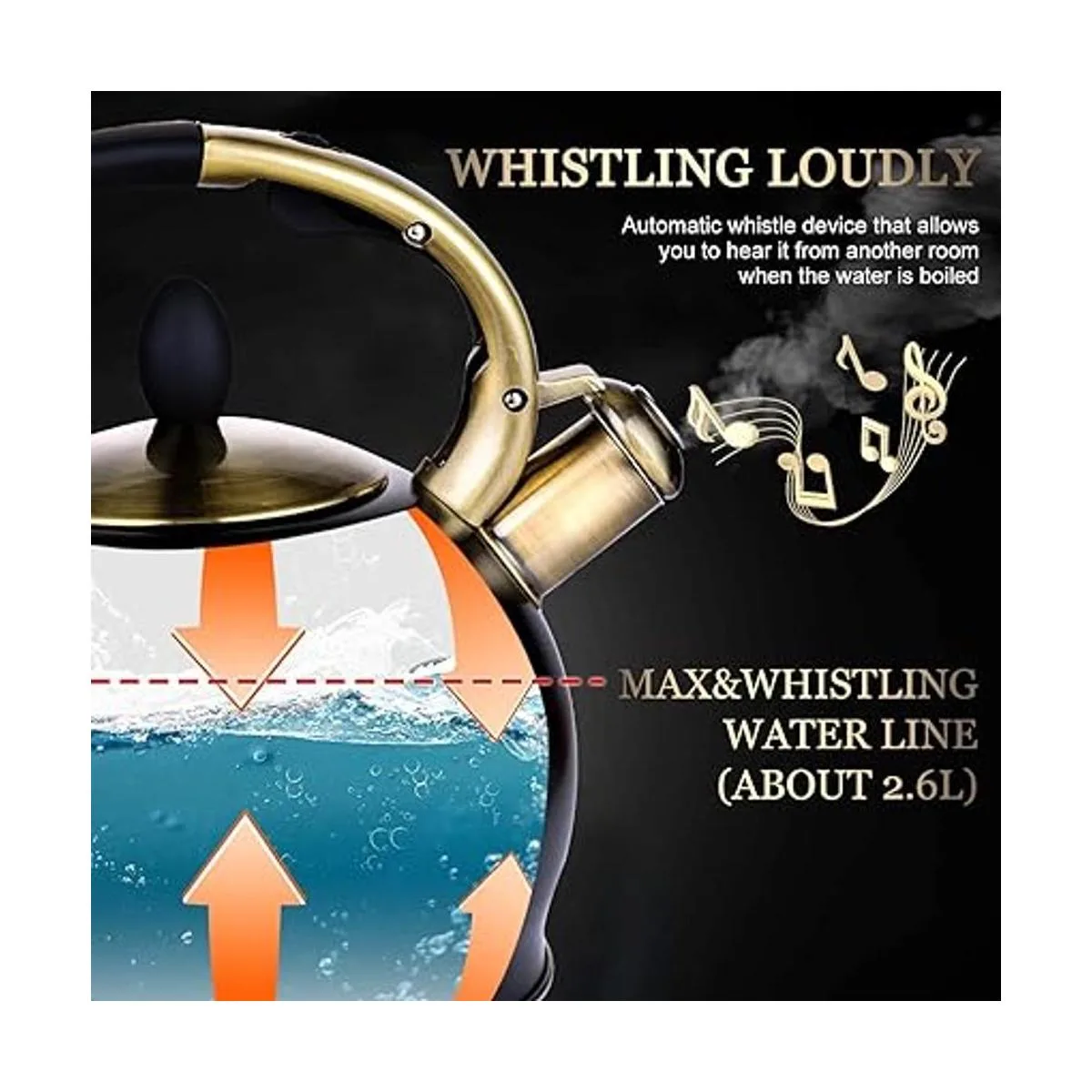Sonido perfecto de silbato Gran capacidad: haz té con este hervidor grande de 3 cuartos para toda tu familia capacidad máxima de ebullición: 2.64 cuartos de galón. El silbato fuerte permite que puedas escucharlo desde otra habitación cuando el agua está hervida. Reduce eficazmente los peligros de seguridad y evita la ebullición excesiva.