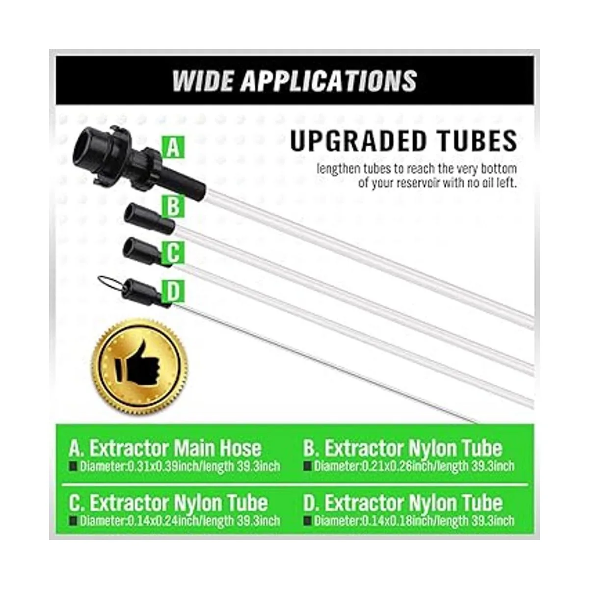 6.5L vacuum fluid extractor comes with 5 different diameter tubes go to the bottom of oil pan. also 3.2 feet flex hose and 3 extra dipstick hoses to reach the bottom of the reservoir and suck up all fluid.