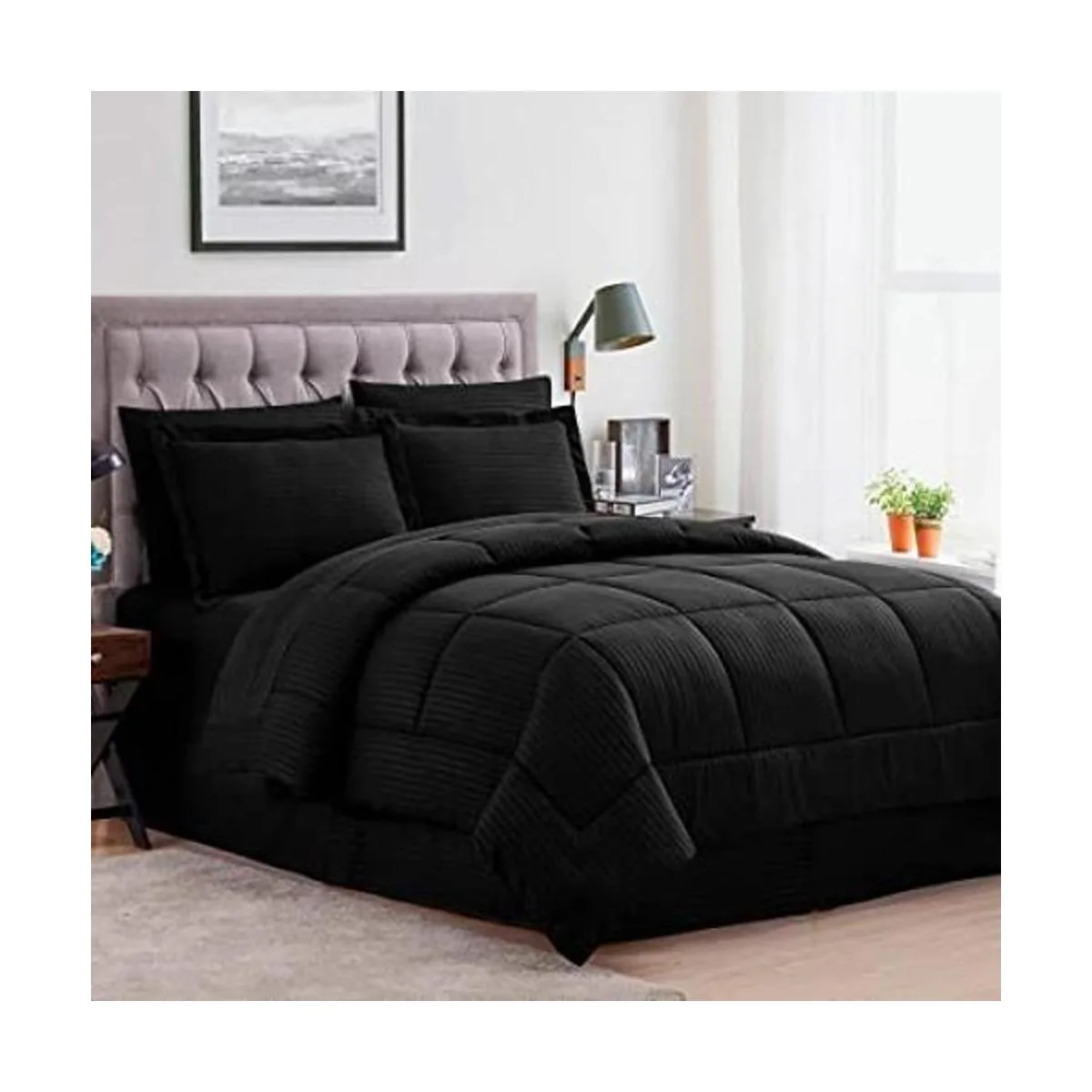 Sweet Home Collection Juego de edredón de 8 piezas, diseño moderno, 2 fundas de almohada, 2 fundas de almohada y falda de cama para todas las estaciones, tamaño Queen, color negro