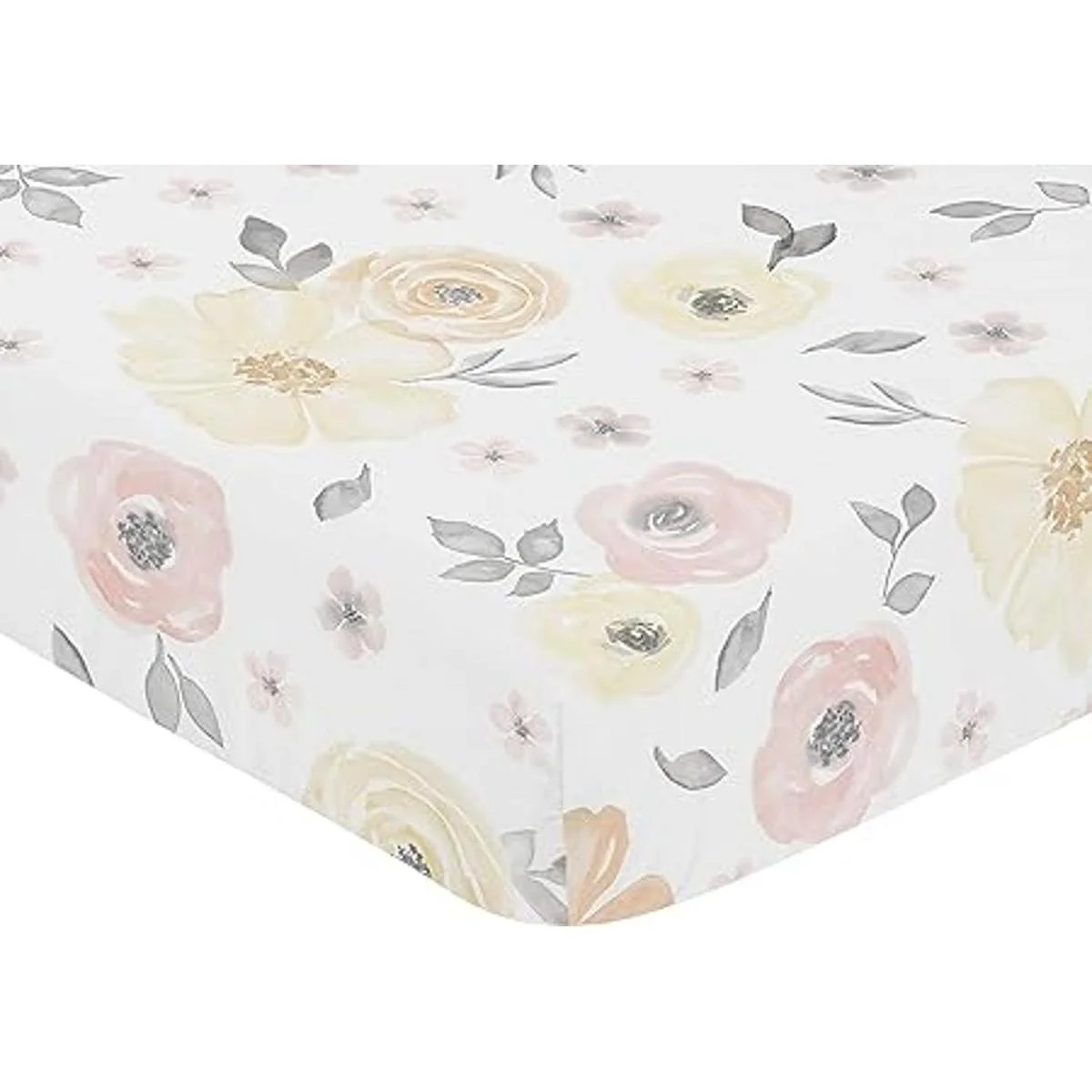 Sweet Jojo Designs Amarillo y Rosa Acuarela Floral Chica Sábana de cuna para bebé o niño pequeño cama de guardería, color melocotón, naranja, crema gris y blanco, Shabby Chic Rose Flower Farmhouse