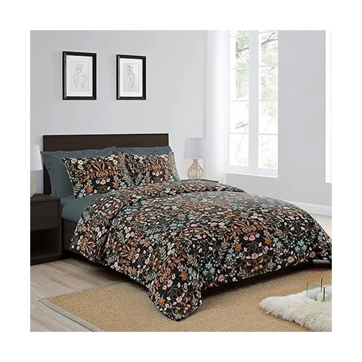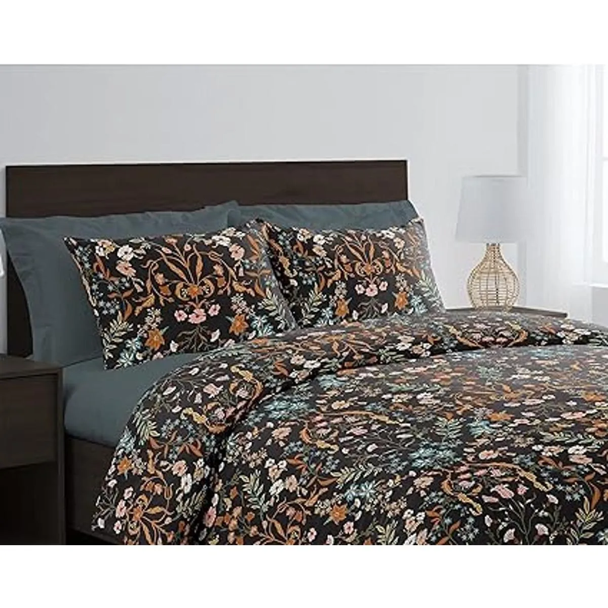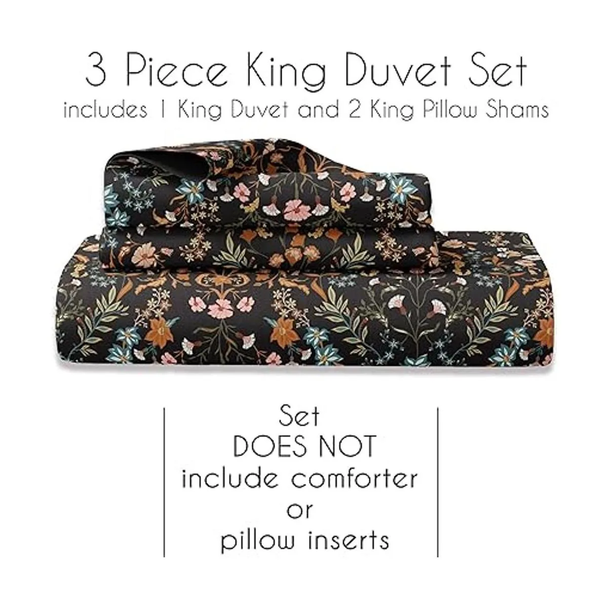 Sweet JoJo Designs Funda de edredón y funda de edredón y funda de edredón bohemio de flores silvestres negras y naranjas de 3 piezas, tamaño King, juego de cama para dormitorio, estampado de flores de cabaña, color turquesa vintage