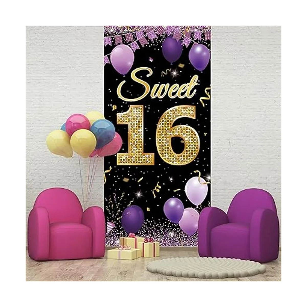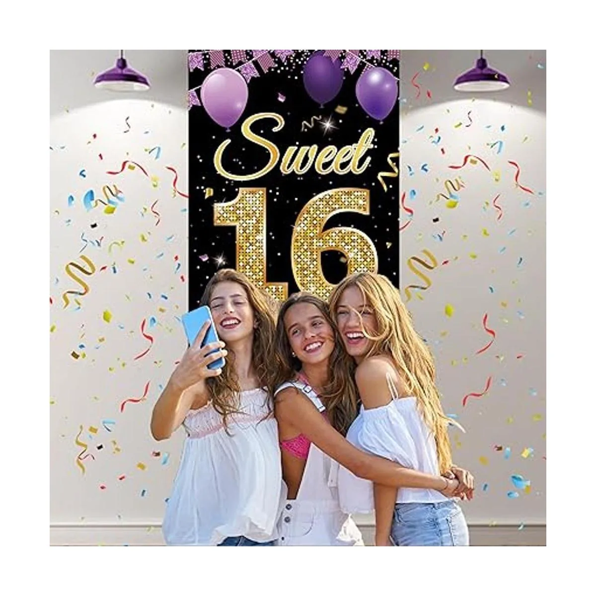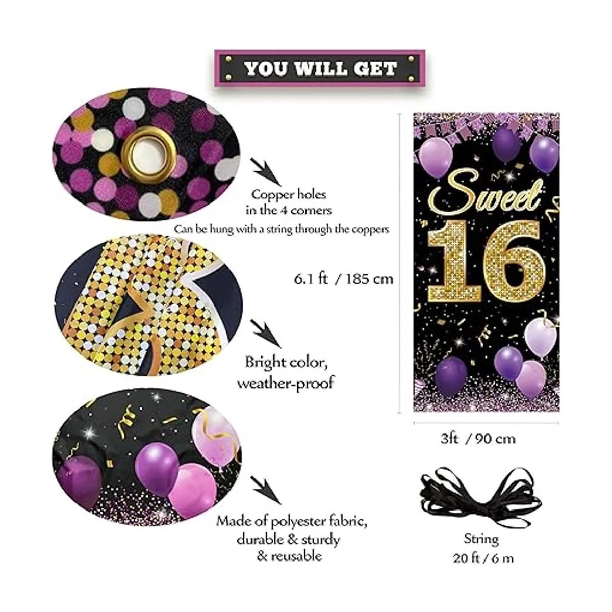 Sweet Póster para puerta de 16 cumpleaños, decoración de feliz cumpleaños número 16 para niñas, color dorado morado, accesorios para cabina de fotos de cumpleaños de dieciséis años, letrero de fiesta de cumpleaños de 16 para exteriores y interiores, resistente, Vicycaty