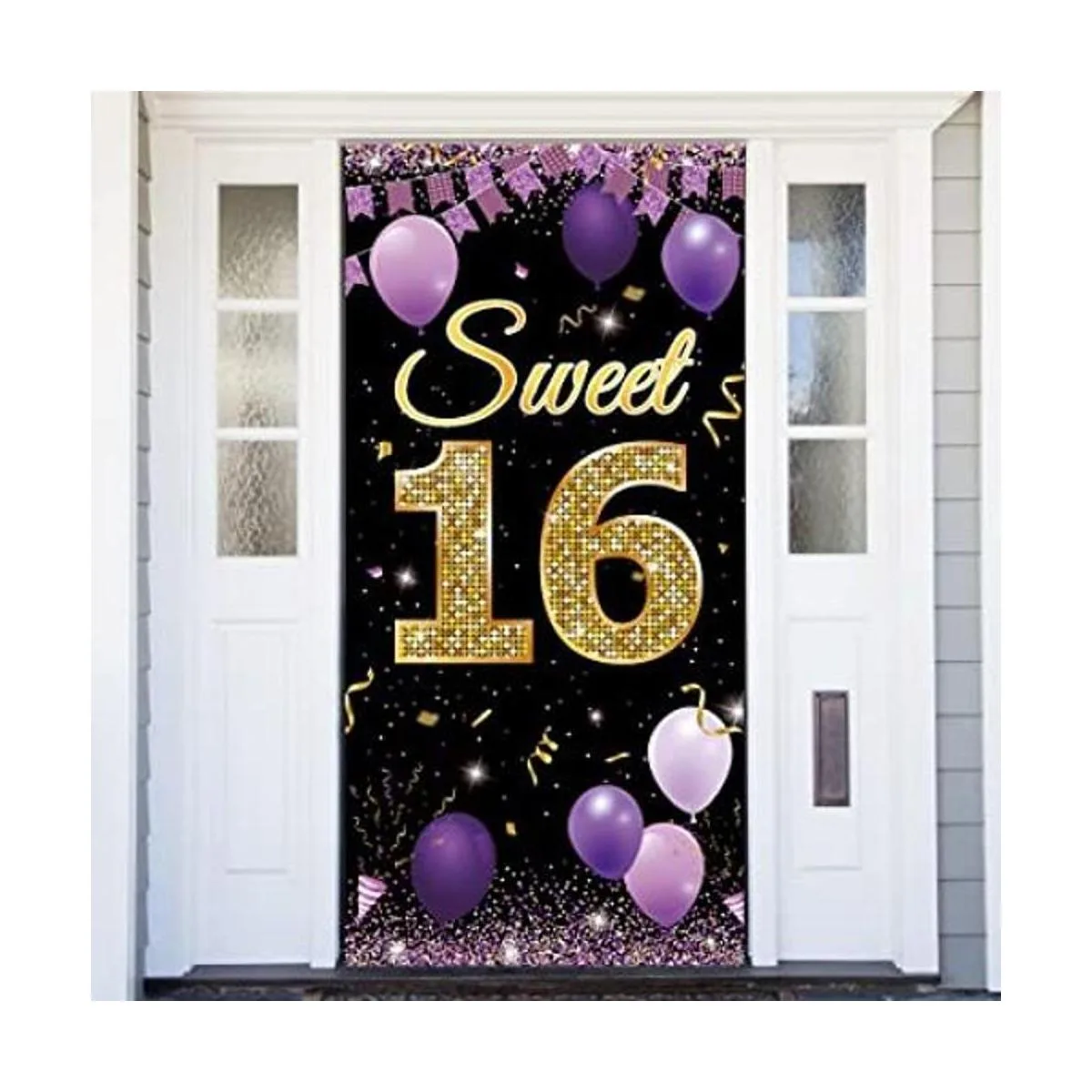 Un exquisito estandarte para puerta de fiesta de 16 cumpleaños vívido y chic, un excelente color dorado morado que añade diseños llamativos que hace que la dulce fiesta de dieciséis cumpleaños sea divertida y dulce. Decoración perfecta para fiestas de cumpleaños número 16 para niñas.