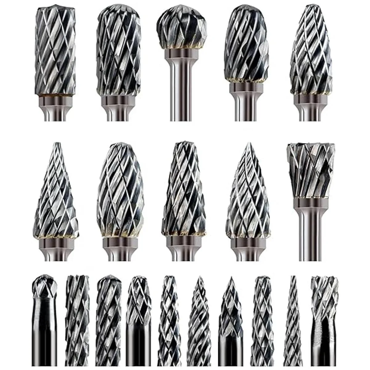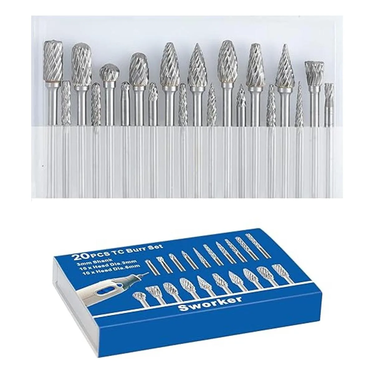 Sworker Juego de rebabas de carburo compatible con vástago Dremel de 18 pulgadas, 20 piezas de herramientas rotativas, puntas de escofina, accesorios de tallado de madera, accesorios de corte, fresas de metal, puerto de grabado de doble corte