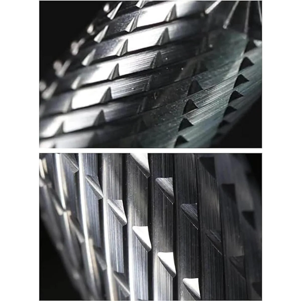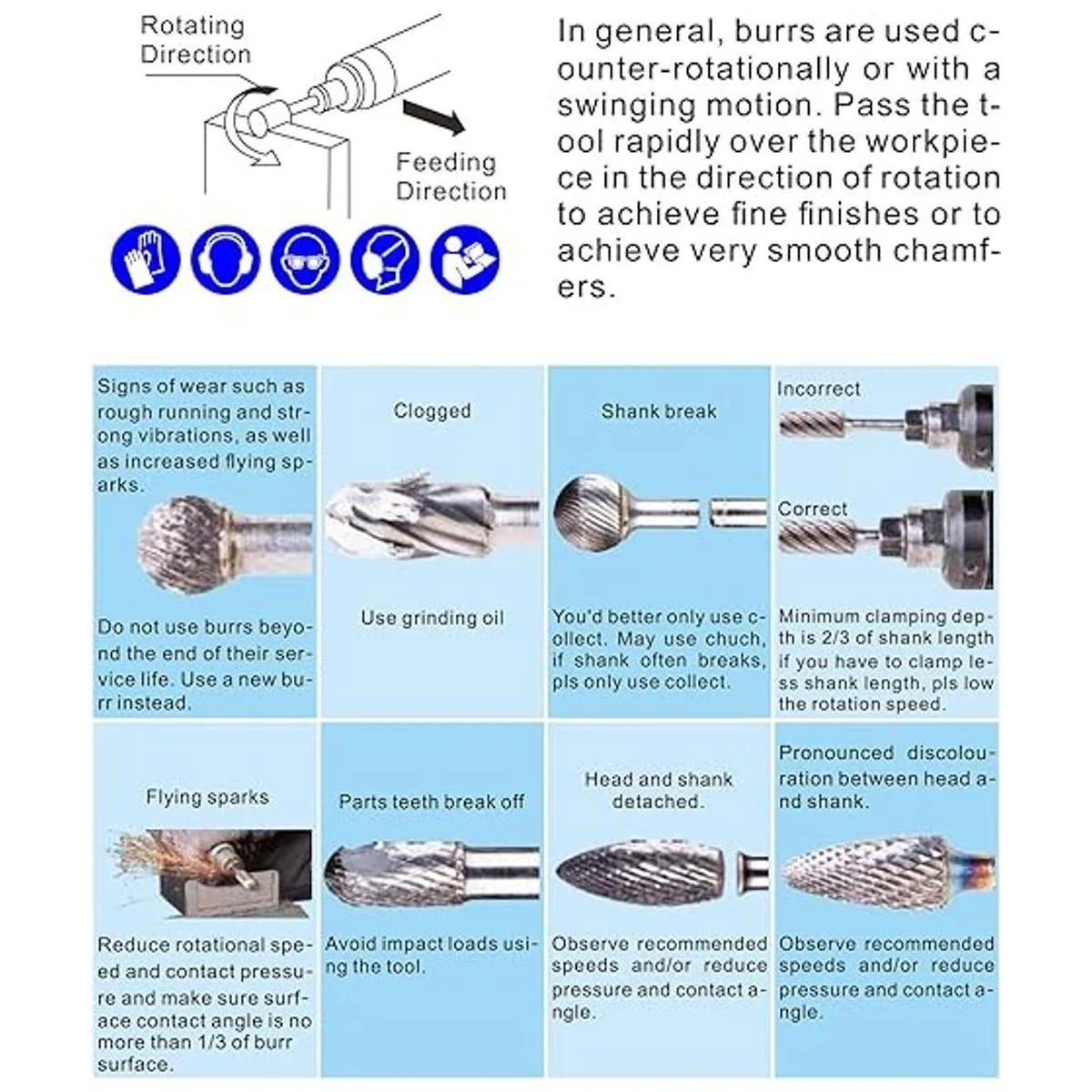 Afilado, duradero y bien equilibrado: el juego de rebabas de carburo corta a través de material extraño como un cuchillo caliente a través de la mantequilla. No se desgasta después de un uso prolongado. El eje no se dobla a alta velocidad.