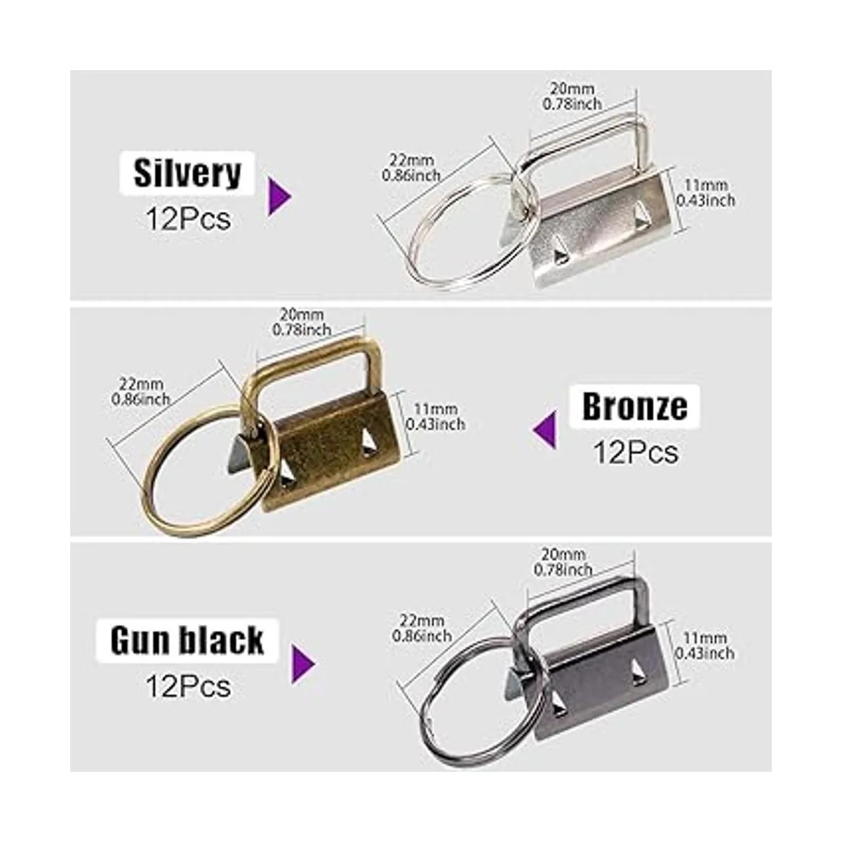 Tamaños del llavero: llavero con base ancha: 1 pulgada o 0.984 in, llavero ancho interior cuadrado superior: 0.63 pulgadas o 0.630 in; llavero ancho exterior cuadrado superior: 0.9 pulgadas o 0.906 in, cantidad: 36 juegos 36 llaveros y 36 llaveros divididos con herramientas. Uso para pulseras con tela, cinta, cincha, relieve.