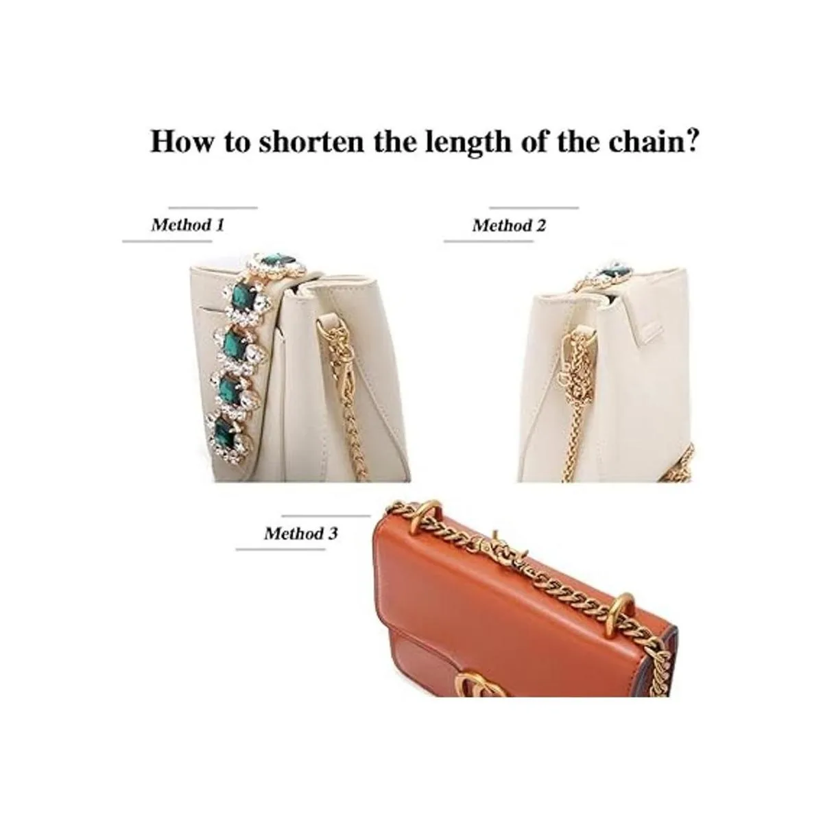 4, antes de usar: debido a que la longitud de la bolsa es diferente de la altura de la persona, el peso y el hábito de uso, se recomienda medir la longitud de la correa de hombro o cadena antes de comprarla. Pero si es demasiado largo, puedes acortar la longitud de acuerdo con nuestra ilustración.