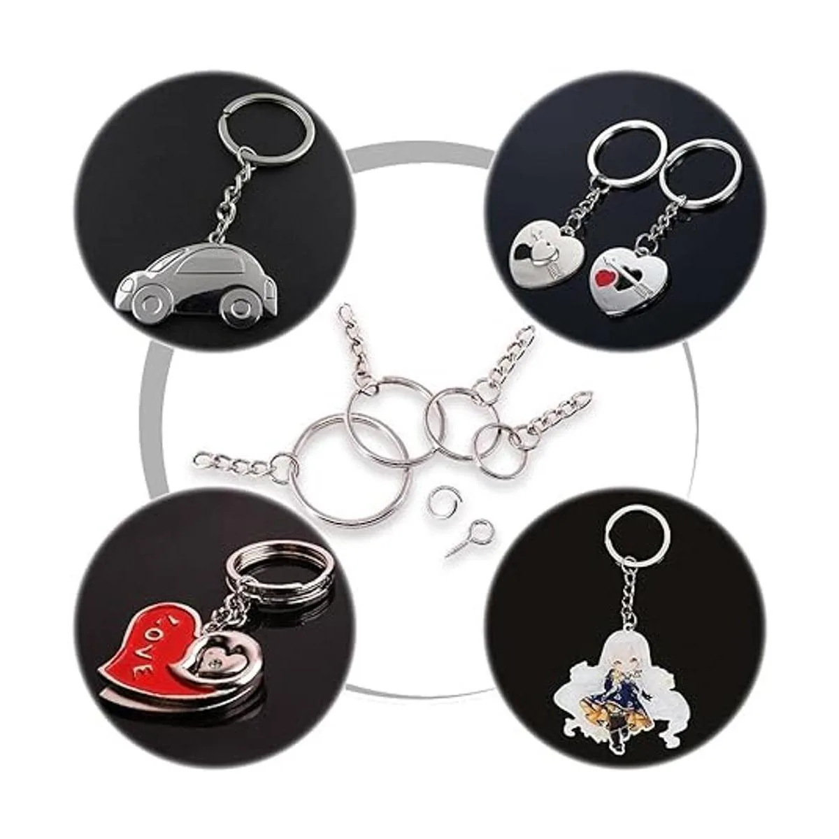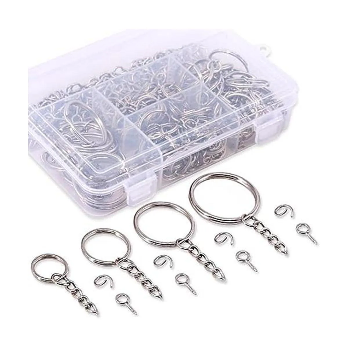 1. Lo que obtienes: hemos preparado 4 tamaños de llaveros para ti, cada paquete tiene 4 tamaños de llaveros con cadena, recibirás 30 piezas x 0.591 in; 25 piezas x 0.787 in; 25 piezas x 0.984 in; 20 piezas x 1.181 in. 100 anillos abiertos y 100 pasadores de ojo de tornillo. Total de 300 piezas de llaveros que satisfarán tus necesidades de proyectos de manualidades.