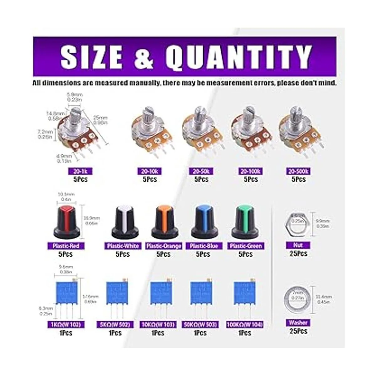 lo que obtienes: en este kit, recibirás 5 piezas de 1 kohm 100 kohm multigiro, 1 kohm 1 mohm resistencia variable lineal de alta precisión con 25 pomos de plástico. potenciómetro giratorio lineal de eje moleteado con 25 tuercas, 25 arandelas y tapas para arduino. en total, 105 piezas pueden satisfacer todas tus necesidades diarias.